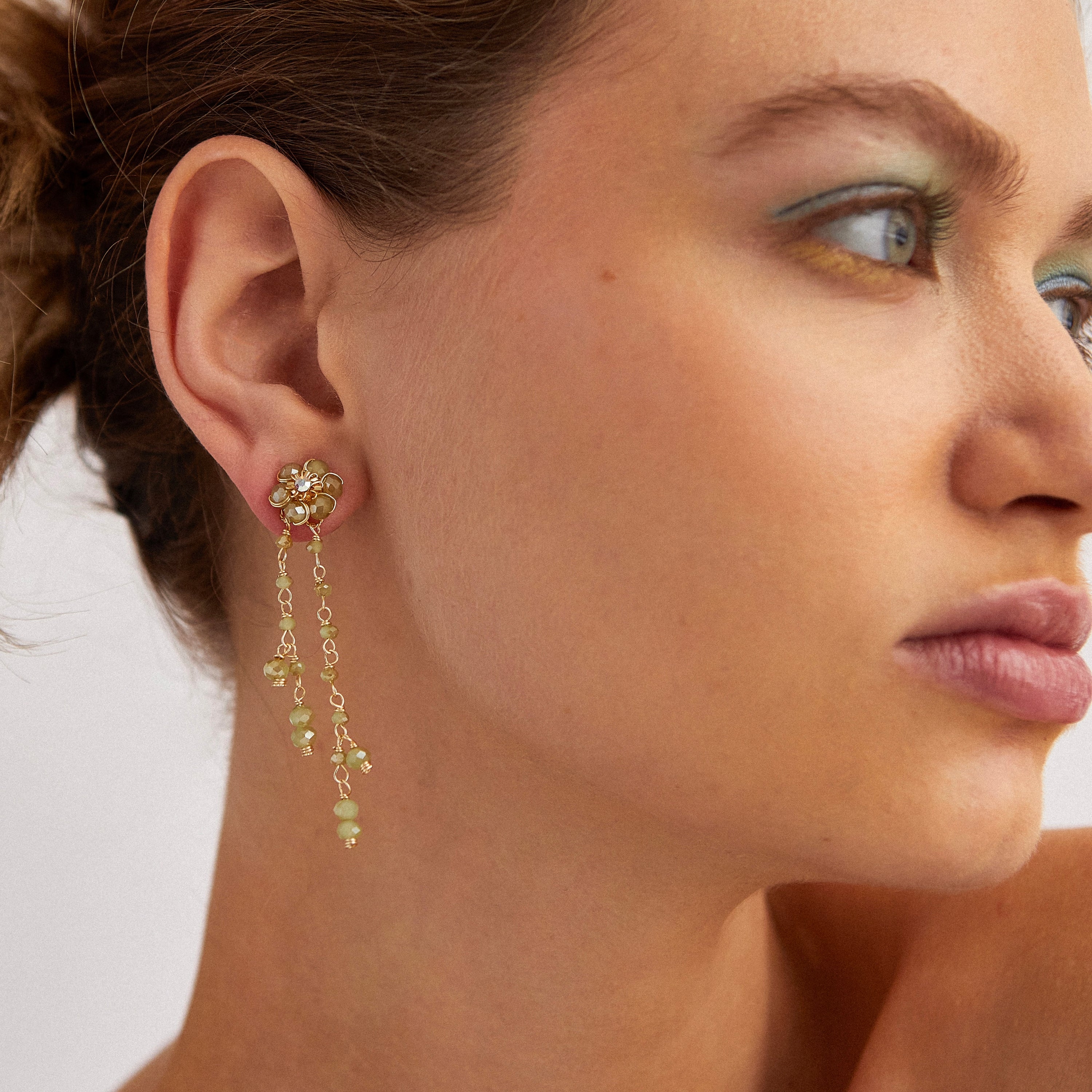Composición: Alambre 99% cobre bañado en plata con tratamiento de esmalte, muranos, mostacillas checas, strass y postes hipoalergénicos.