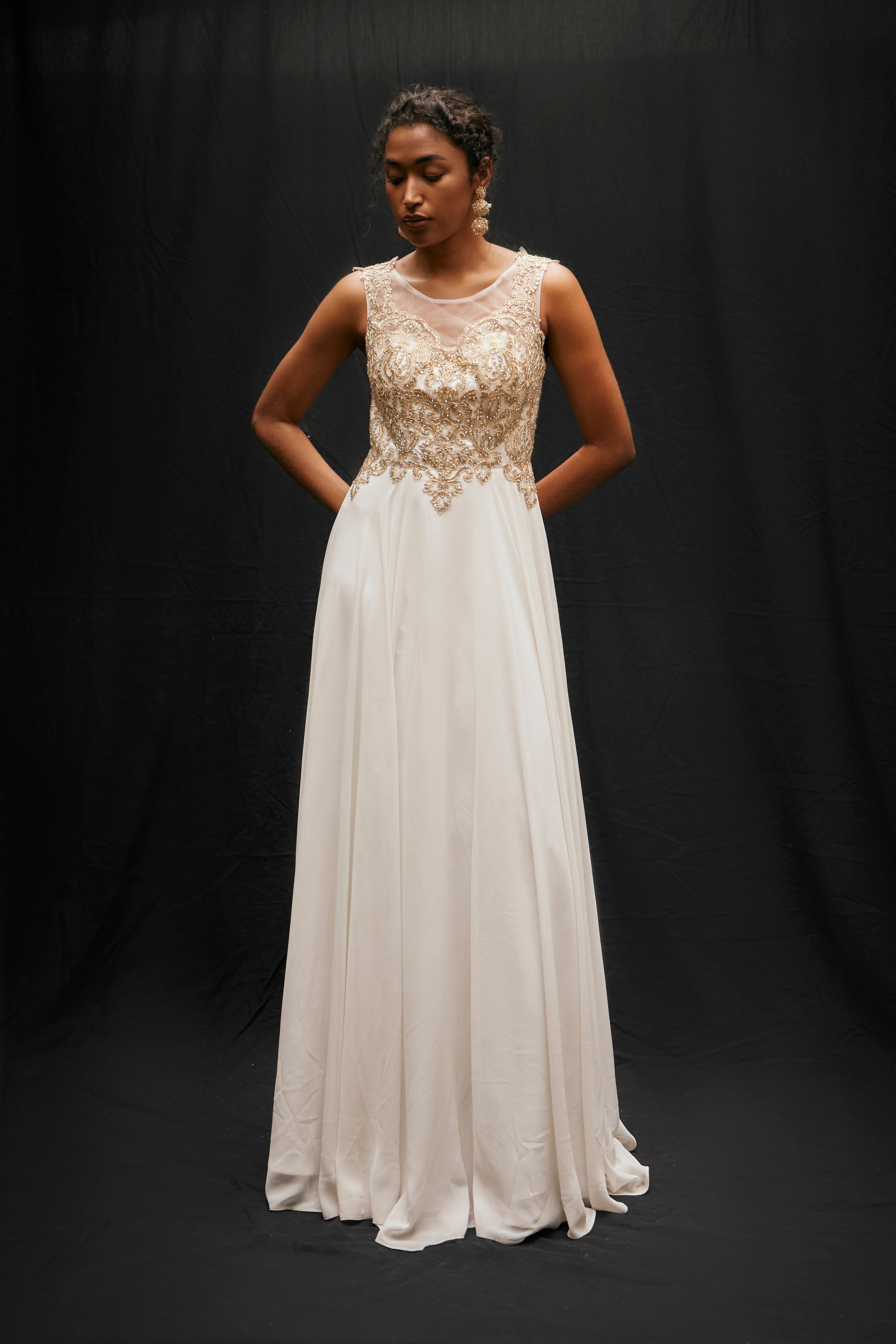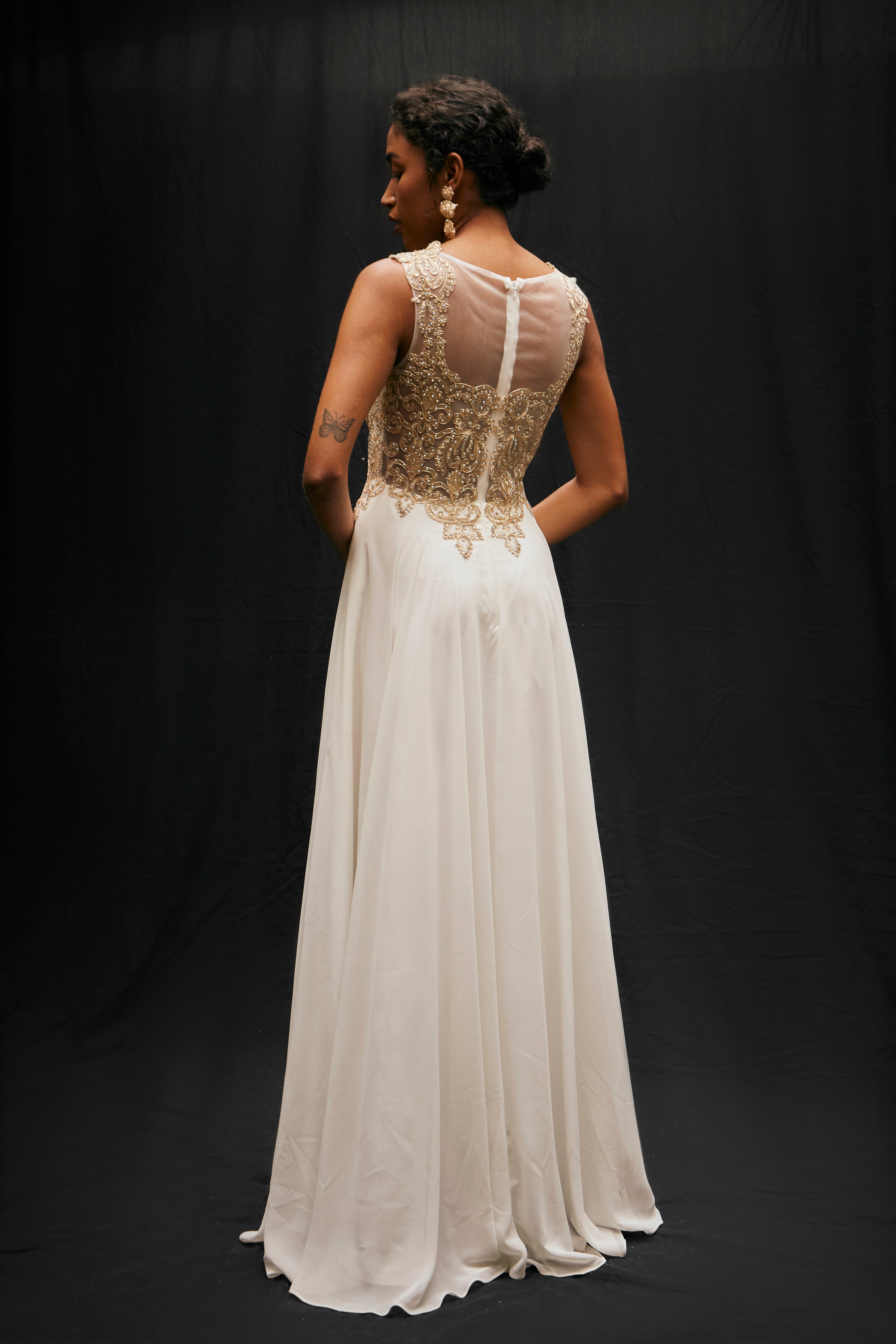 Vestido largo, corte A con cola y aplicaciones de bordados dorados y detalles de strass tornasol en el pecho.