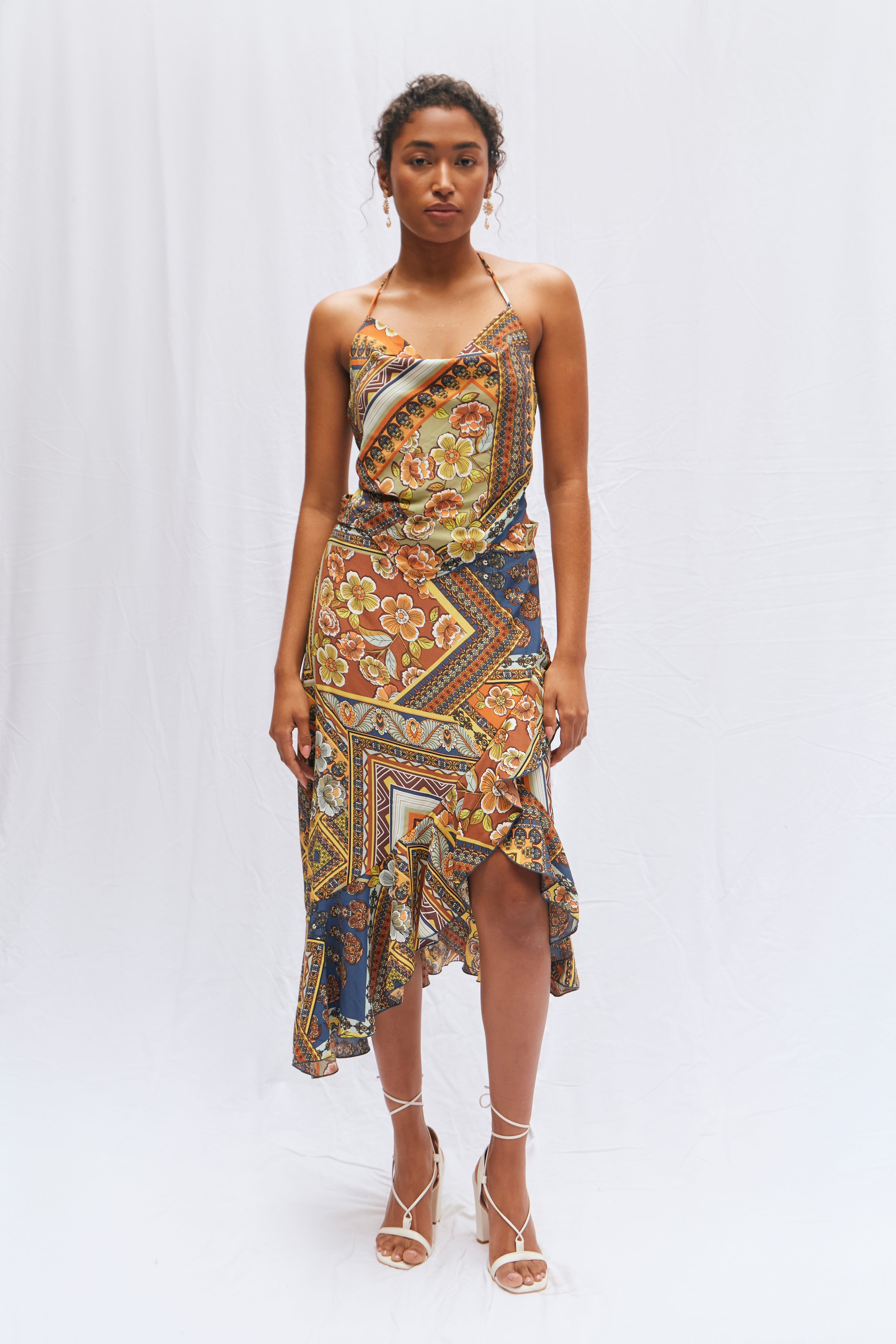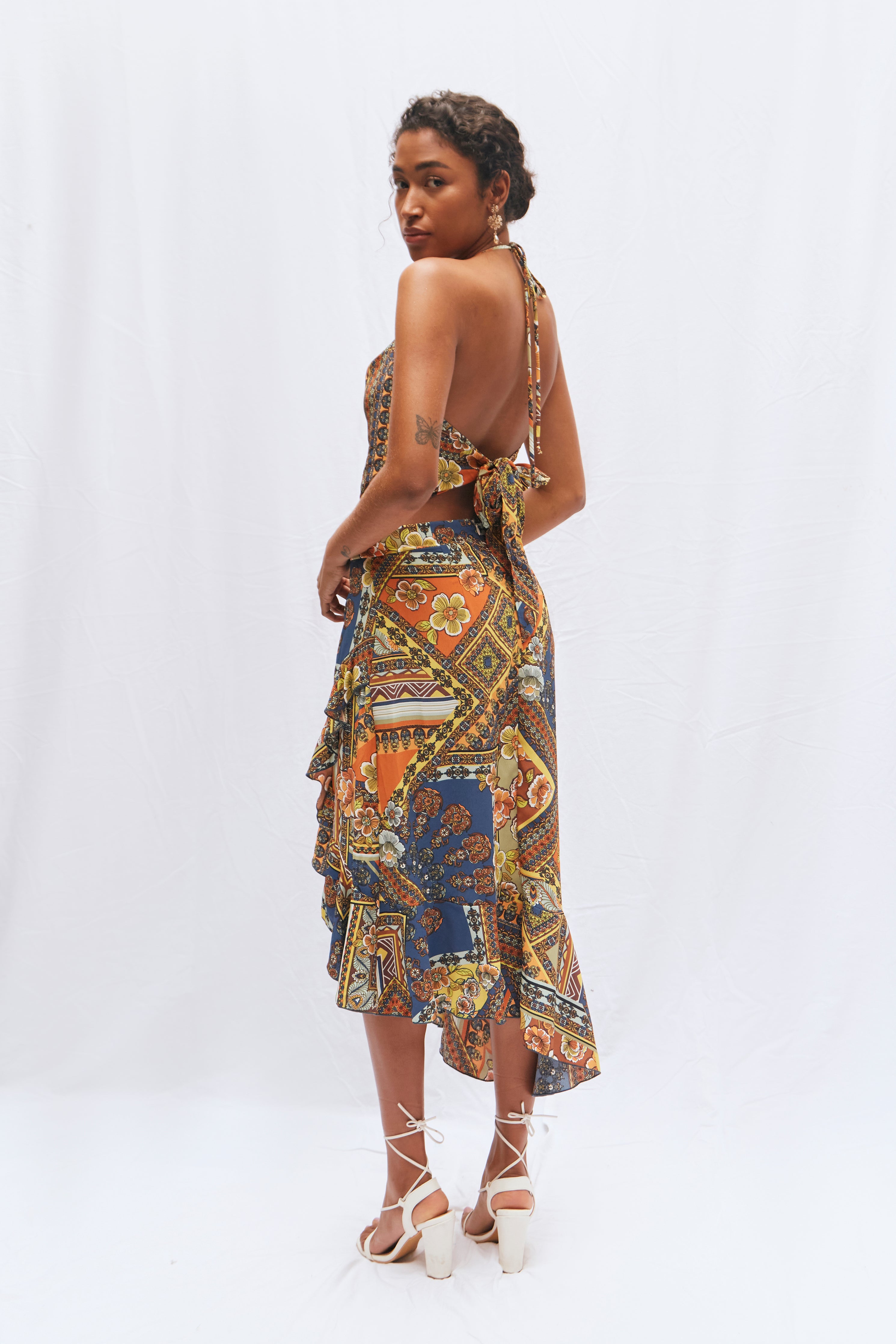 Set de dos piezas print (falda y top). Top atable en el cuello y espalda, falda midi envolvente con detalle de ondas en la basta. Geniales juntos o por separado, combinando el top con tus pantalones o shorts favoritos y la falda con tu top preferido.