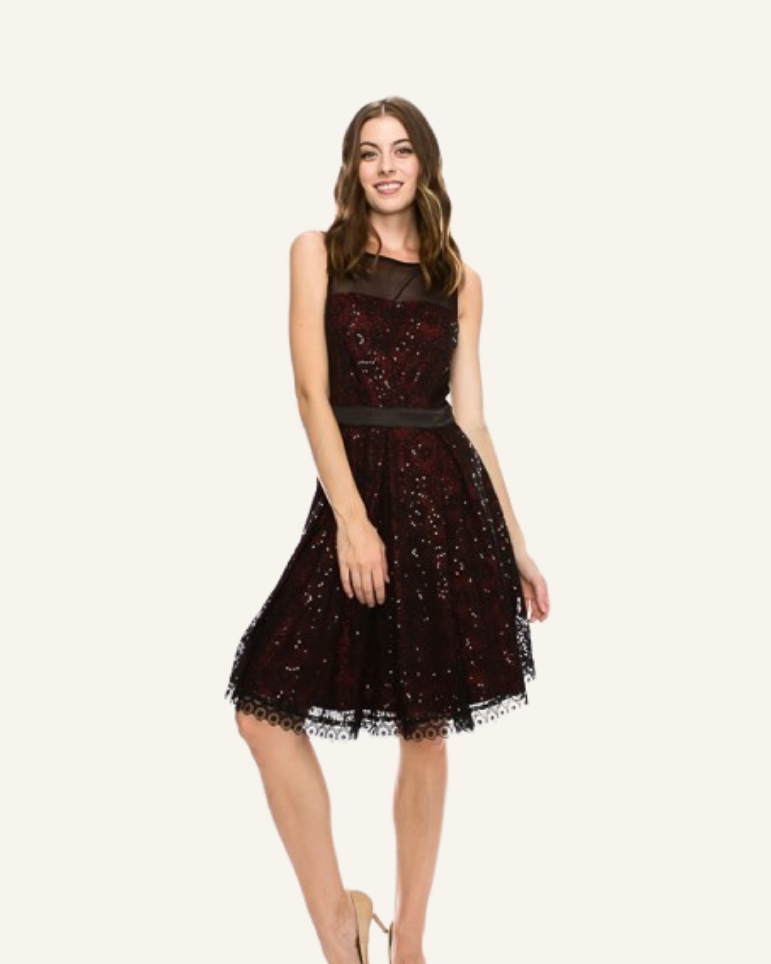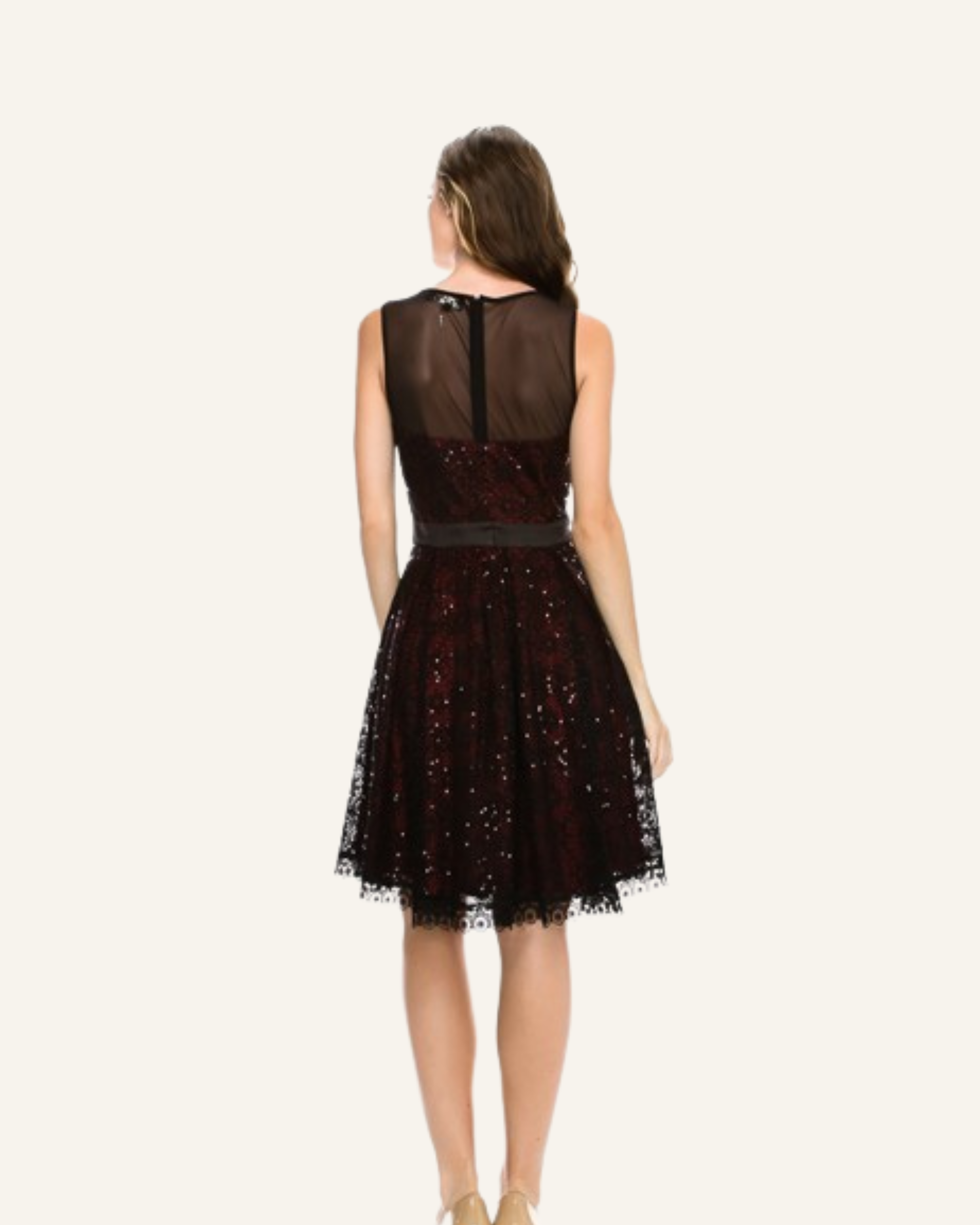 Vestido midi de encaje con lentejuelas negras, diseño sin mangas, cintura ajustada, falda acampanada, paneles translúcidos, cuello redondo y cierre en la parte posterior.