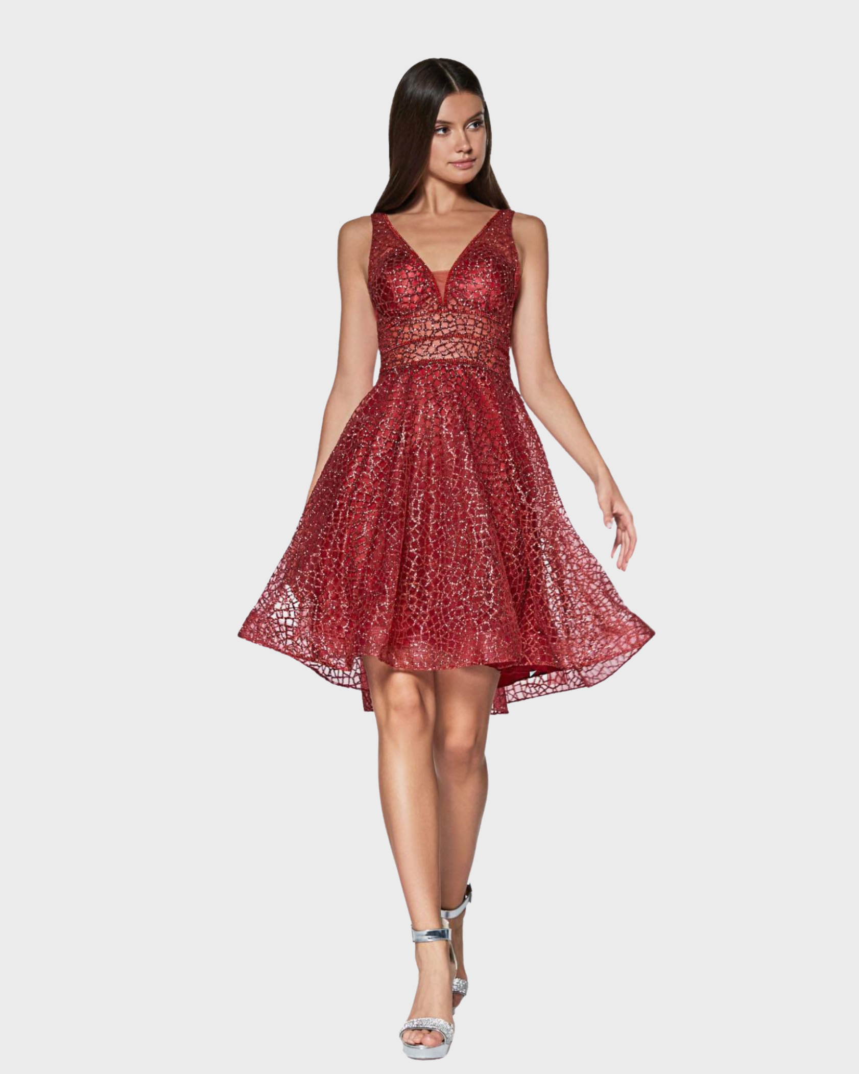 Vestido corto, cortea,cuello v, y transparencia en los costado y en la cintura.
