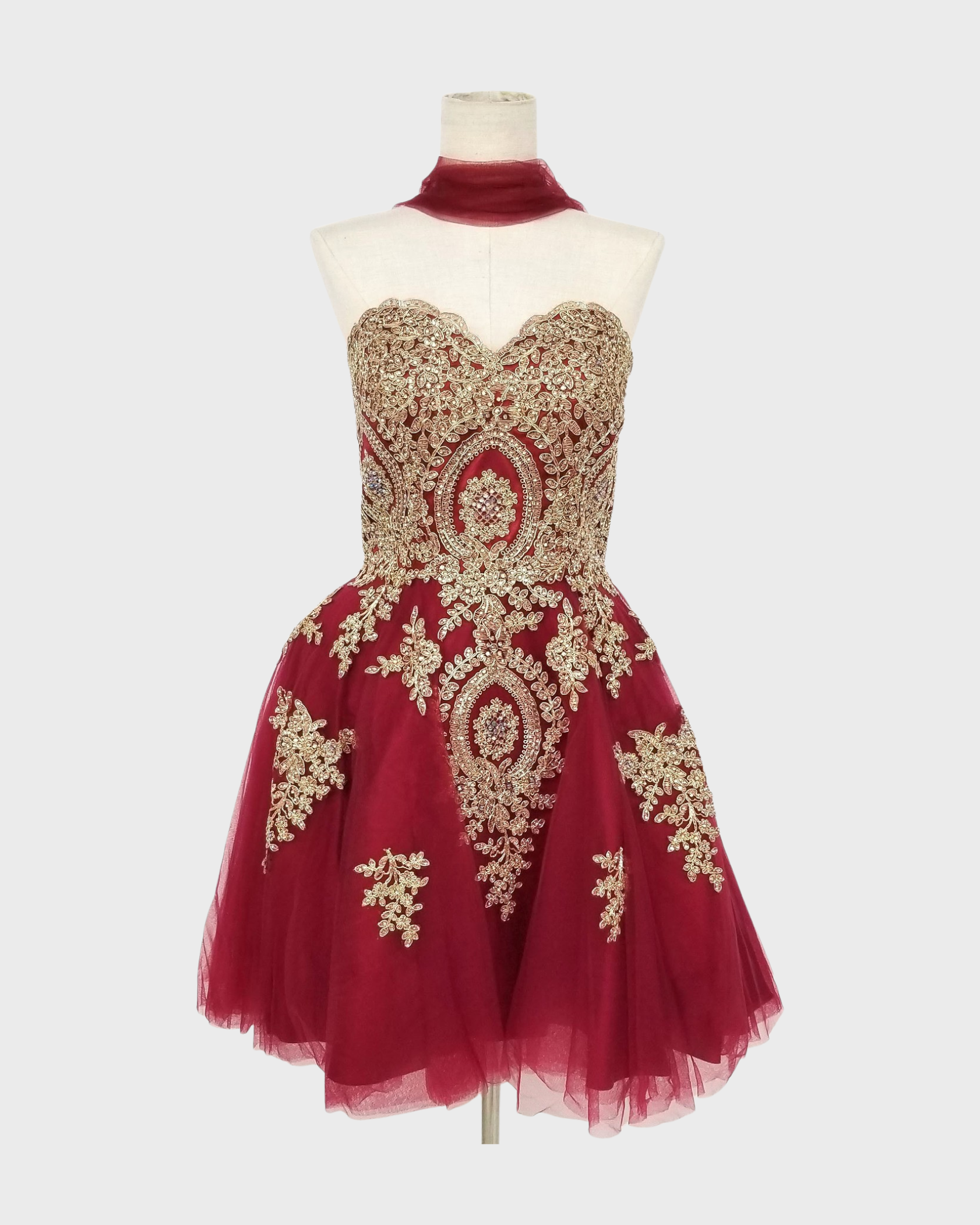 Vestido corto, strapless, corsé ajustable en la espalda, corte A con aplicaciones de bordados dorados y detalles de strass tornasol.