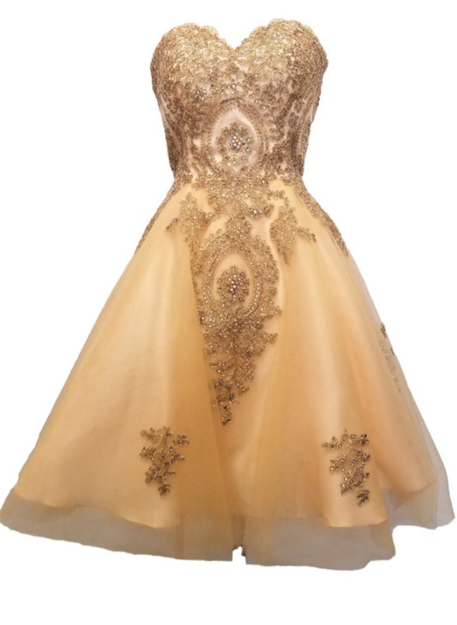 Vestido corto, strapless, corsé ajustable en la espalda, corte A con aplicaciones de bordados dorados y detalles de strass tornasol.