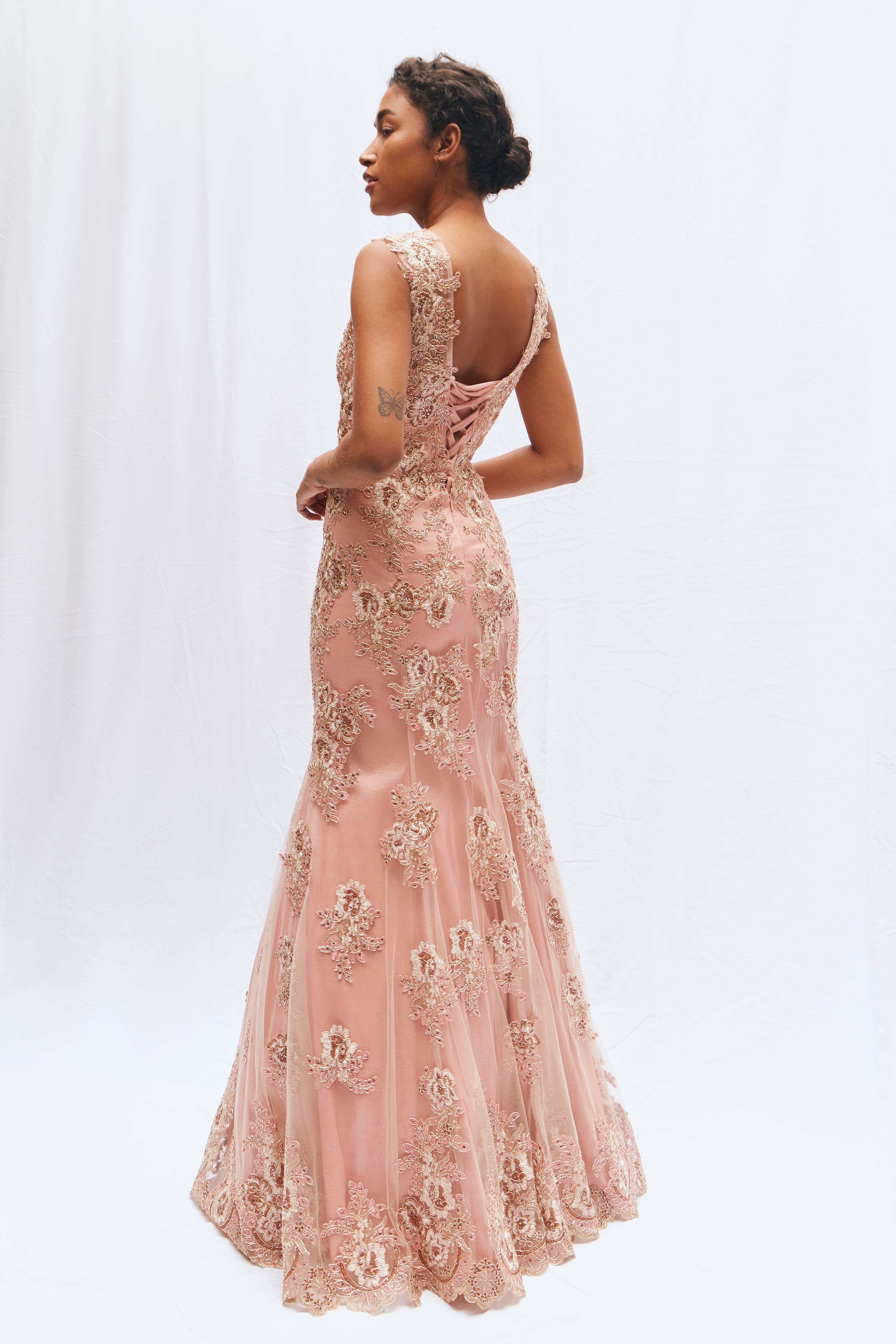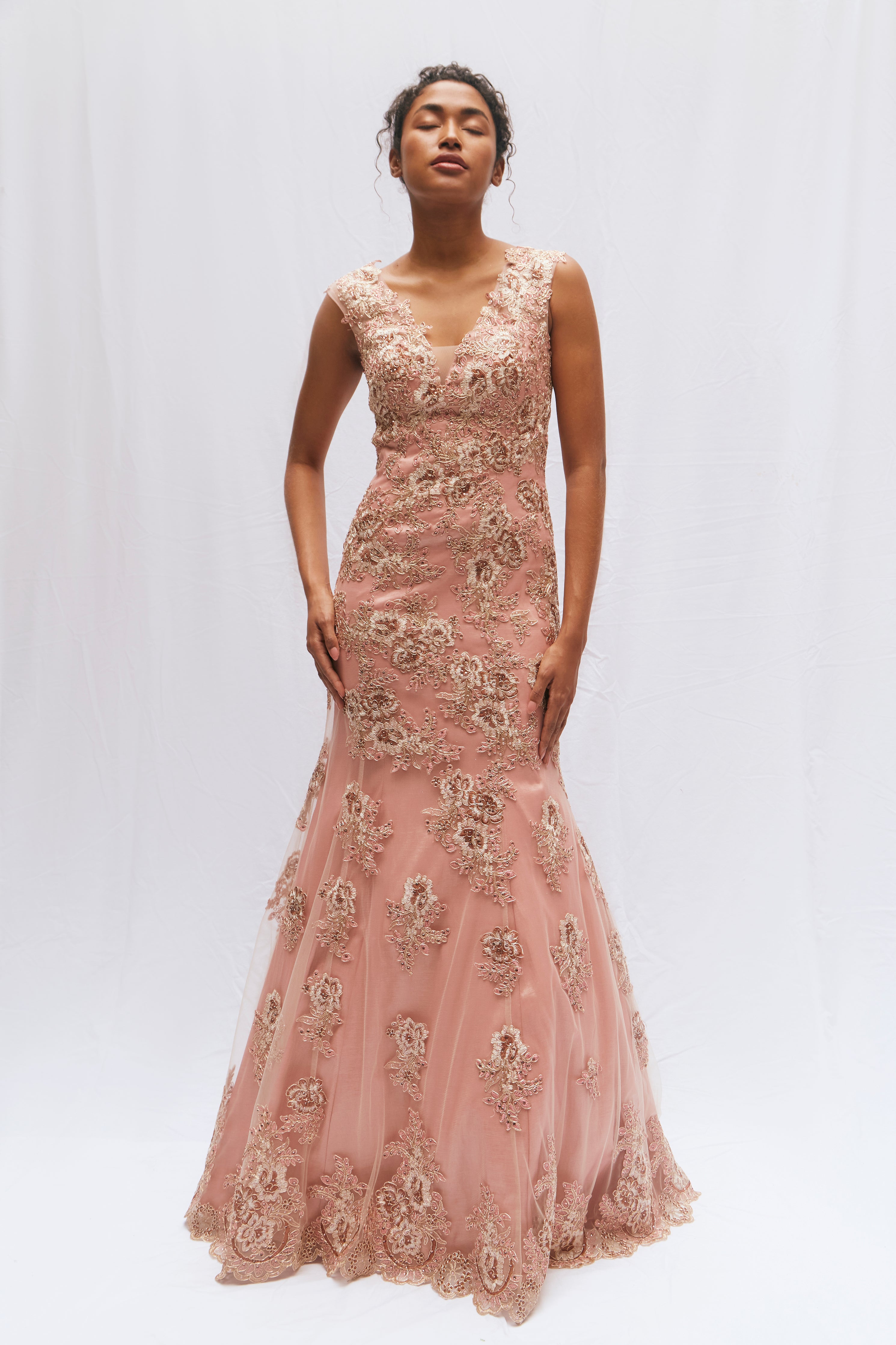 Vestido largo, corte sirena, cuello V, corsé ajustable en la espalda y aplicaciones en bordado dorado.