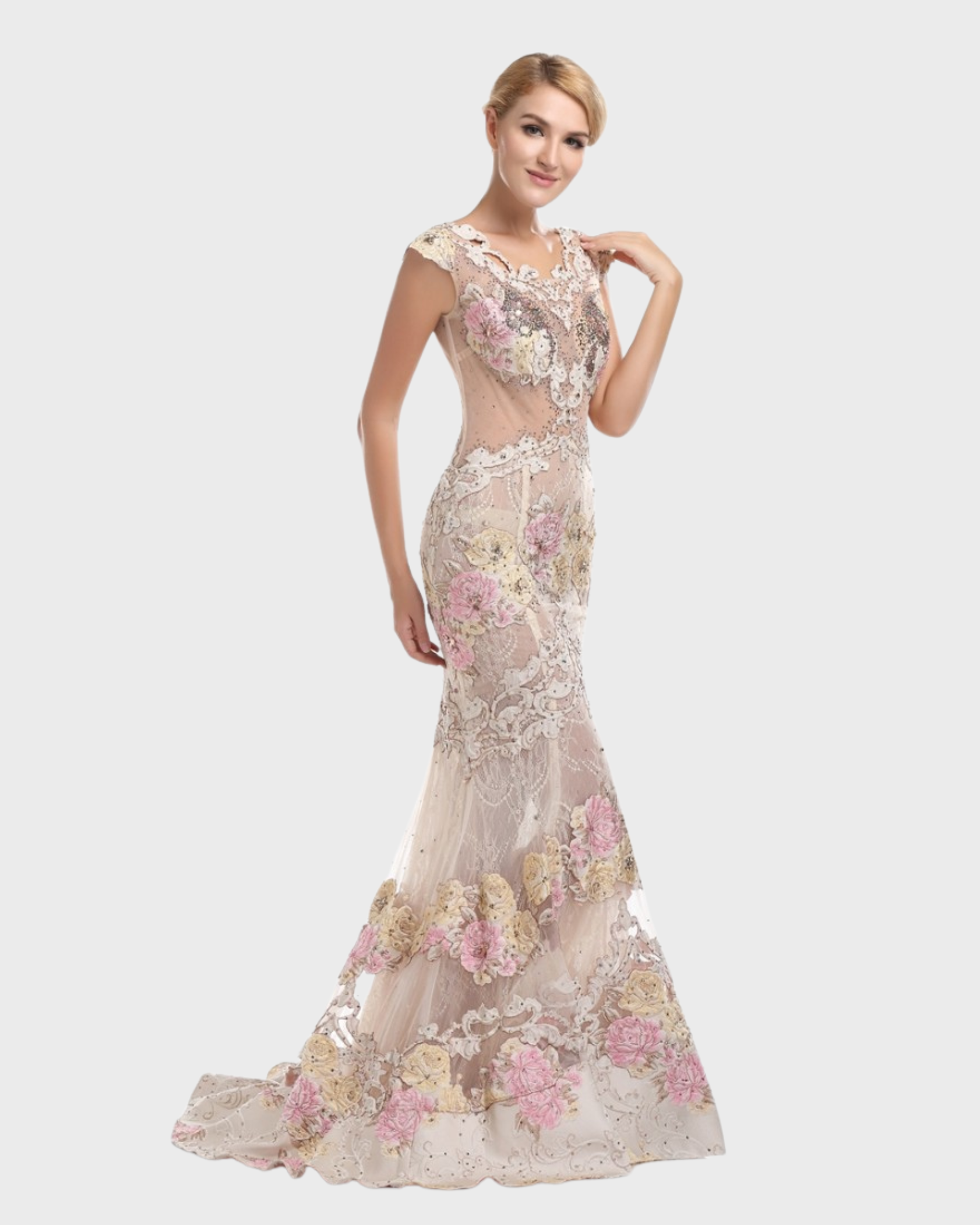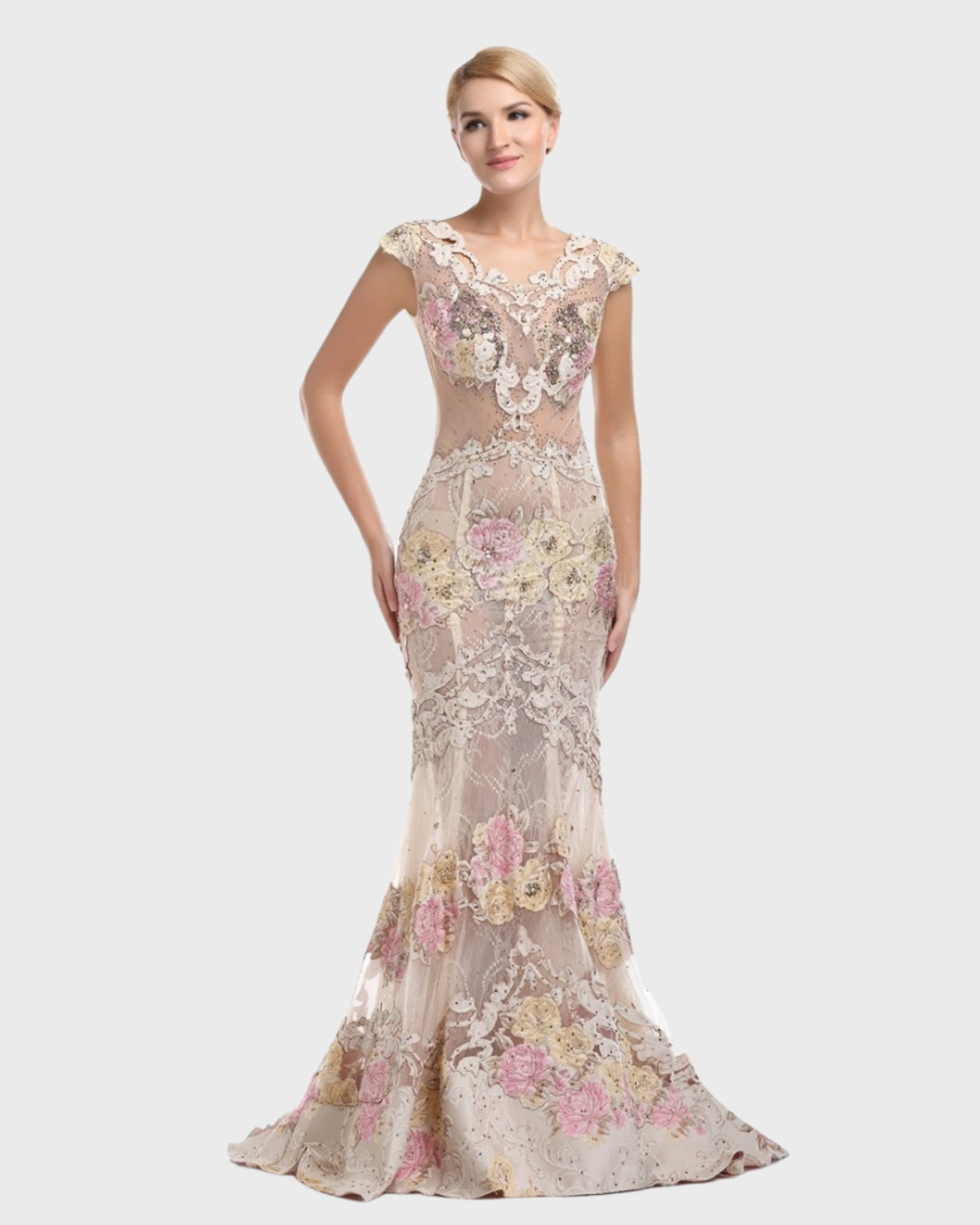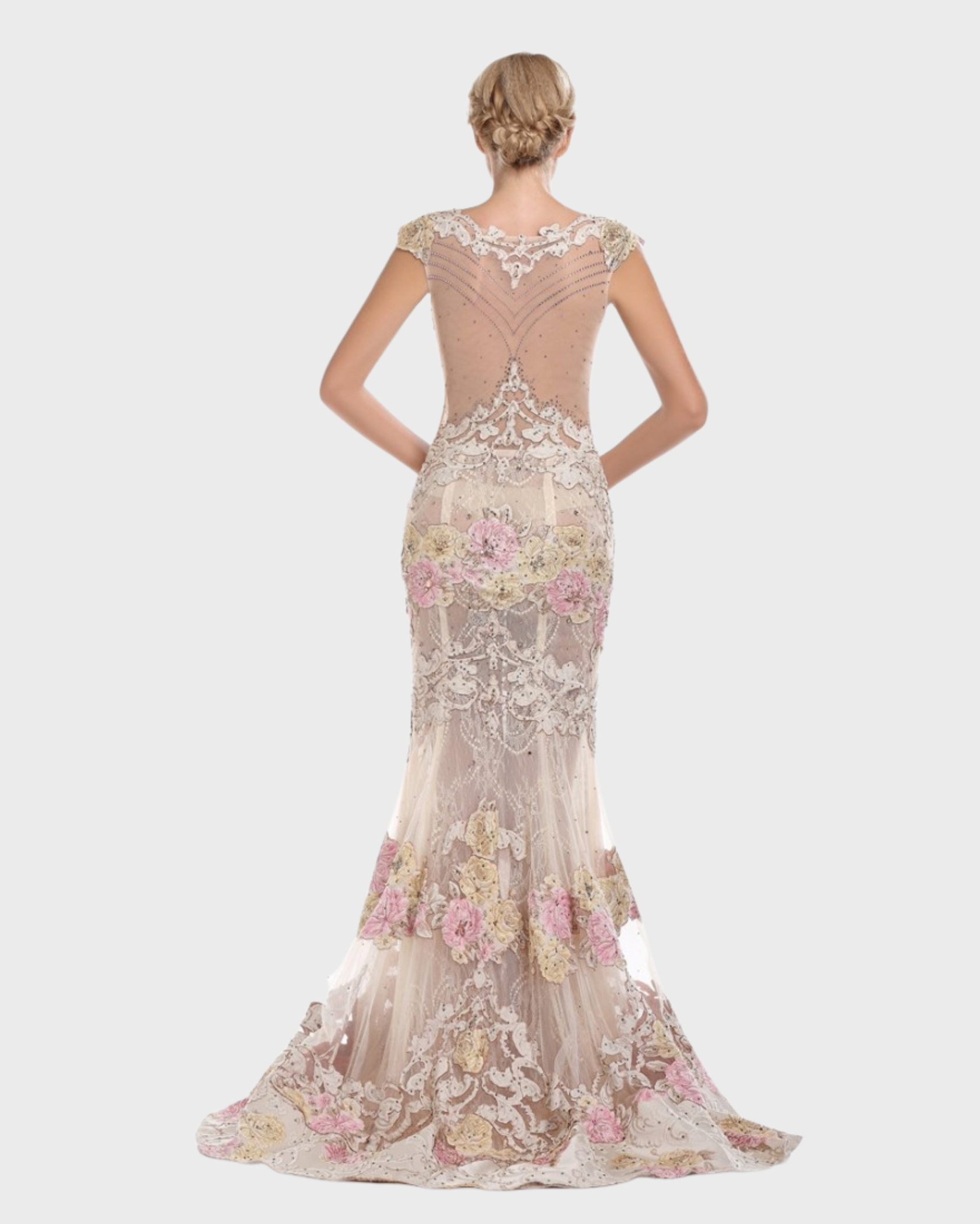 Vestido largo, corte sirena de tull con aplicaciones de bordados y detalles de strass tornasol.