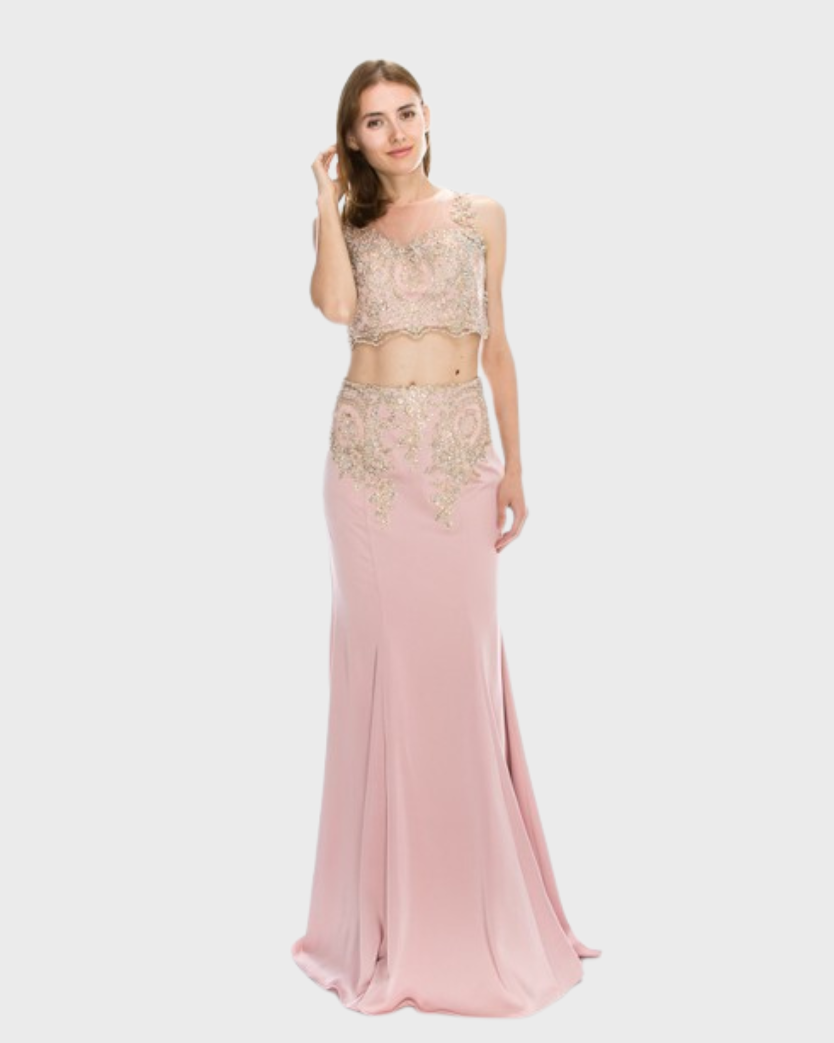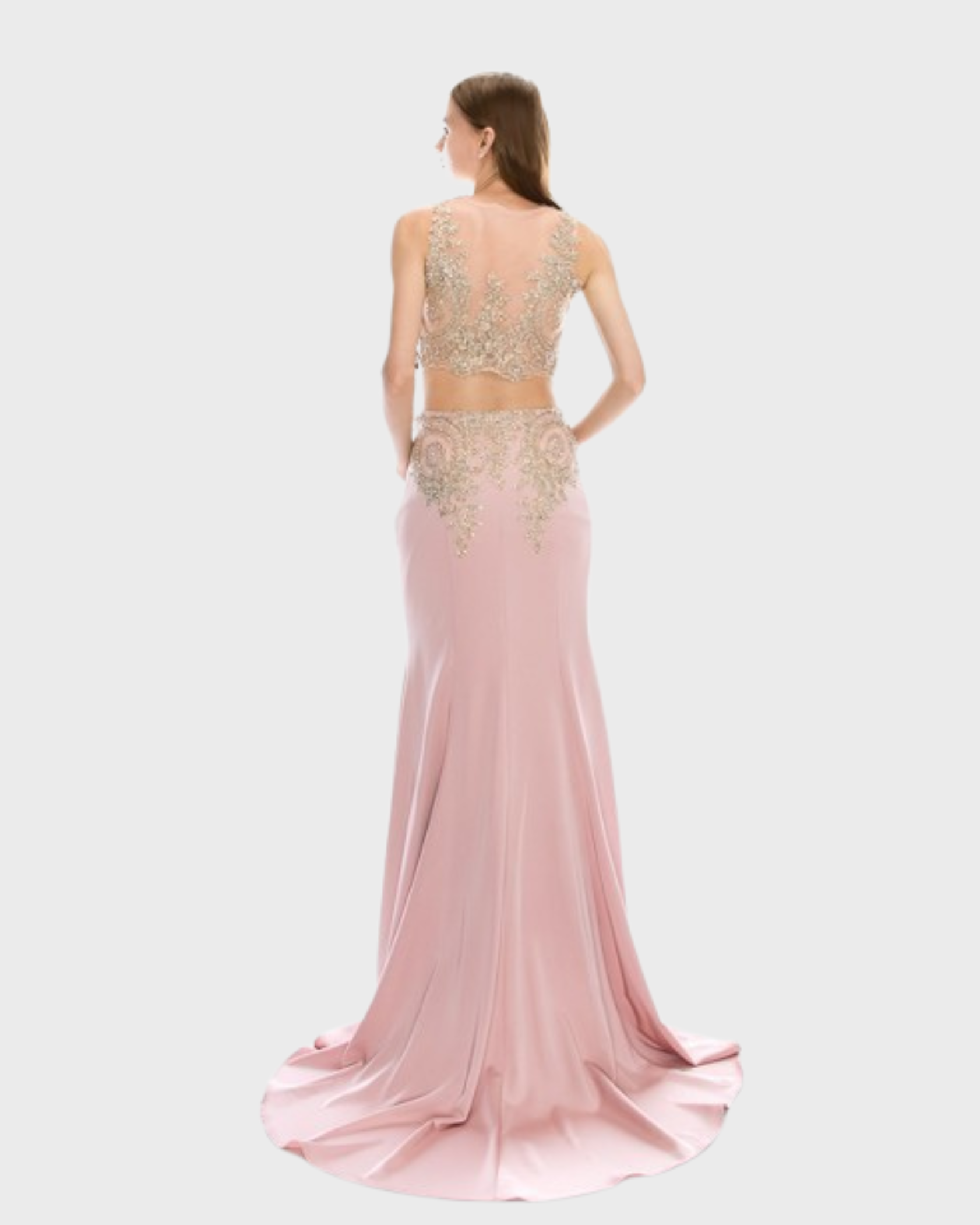 Vestido largo, corte sirena con cola y aplicaciones de bordados dorados y detalles de strass tornasol.