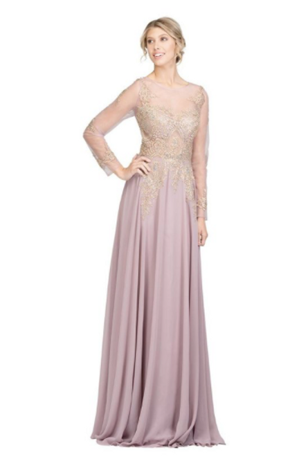 Vestido largo, manga larga, corte A, cuello redondo, aplicaciones doradas en el pecho y espalda con detalles de strass tornasol.