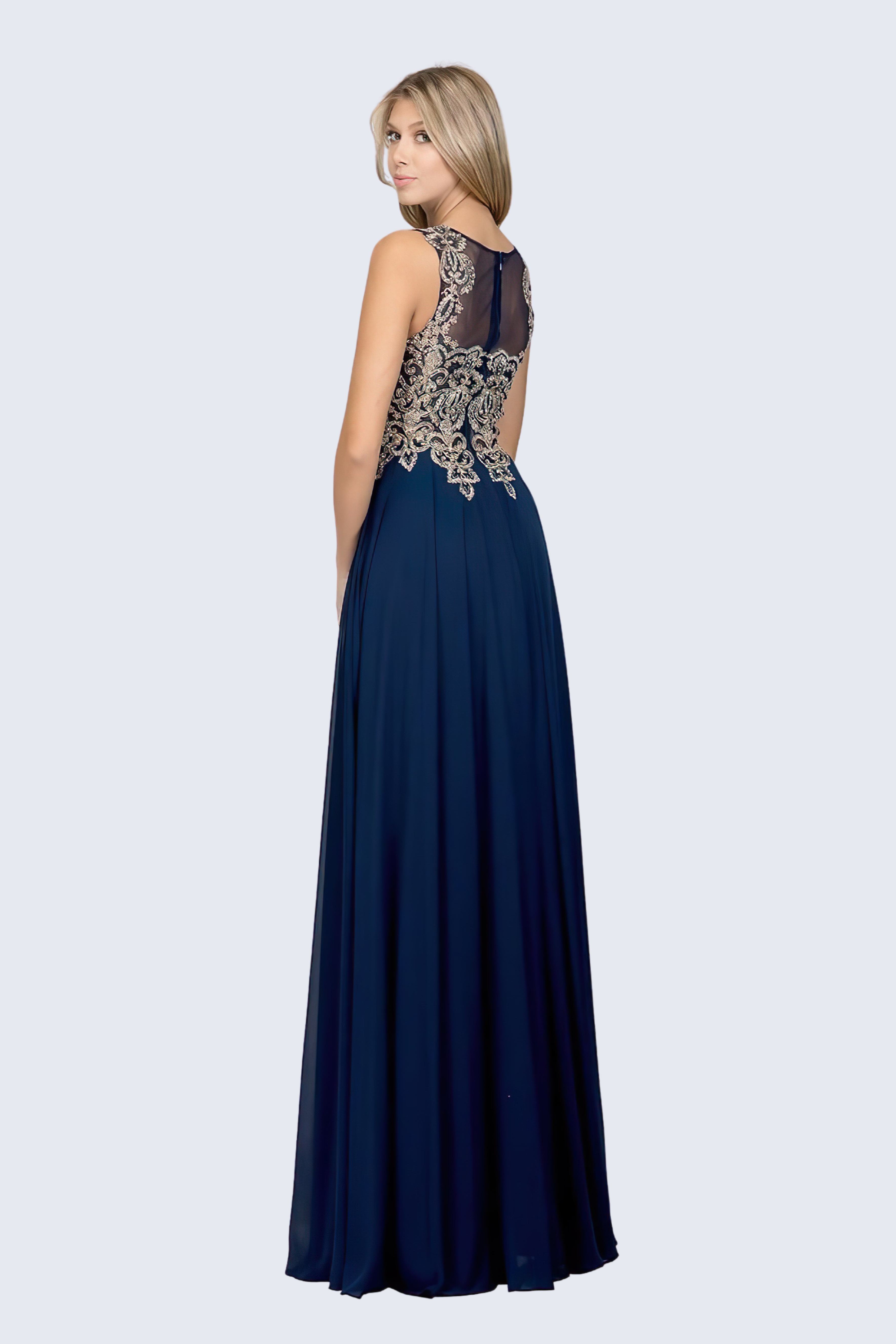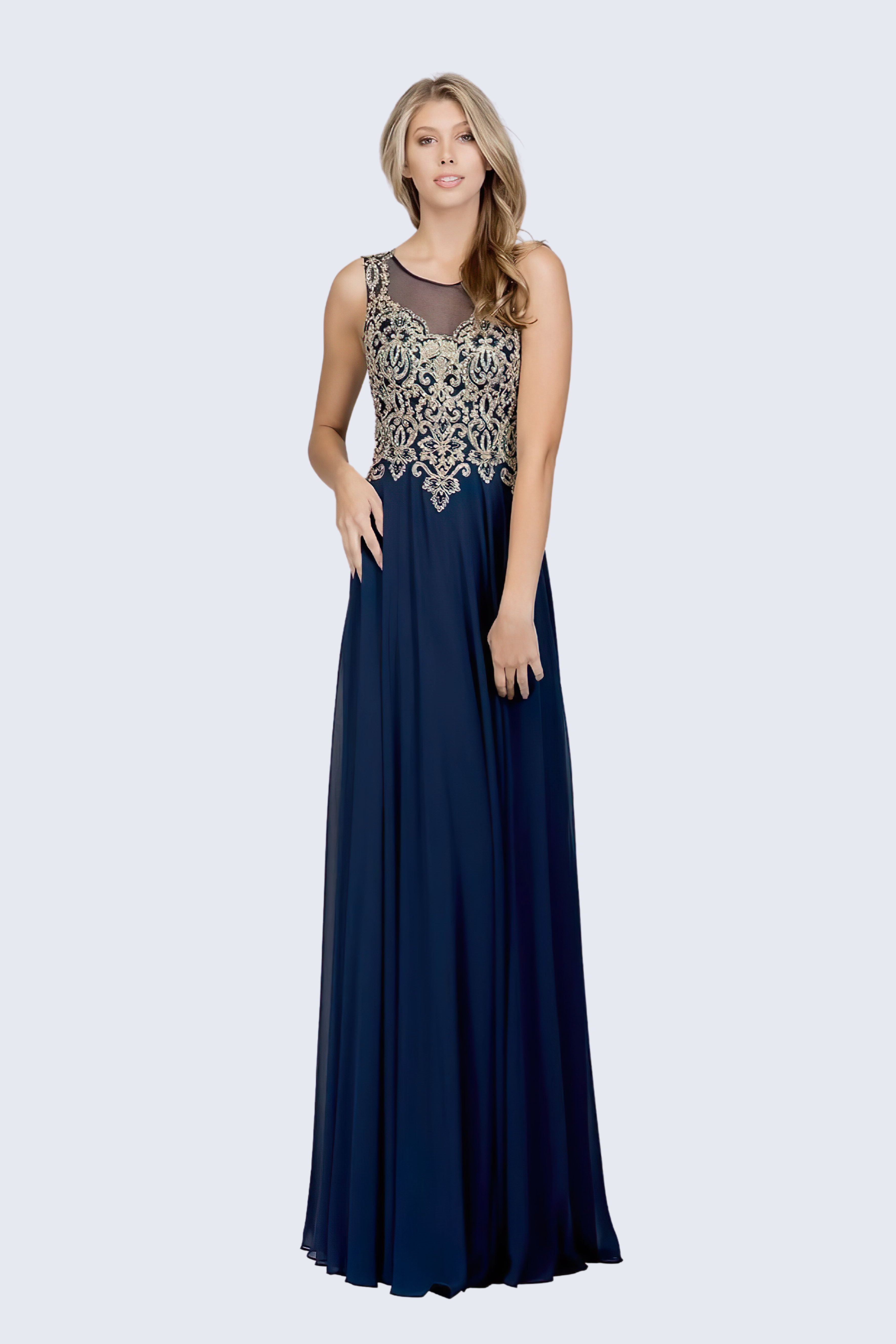 Vestido largo, corte A con cola y aplicaciones de bordados dorados y detalles de strass tornasol en el pecho.