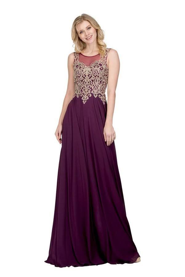 Vestido largo, corte A con cola y aplicaciones de bordados dorados y detalles de strass tornasol en el pecho.