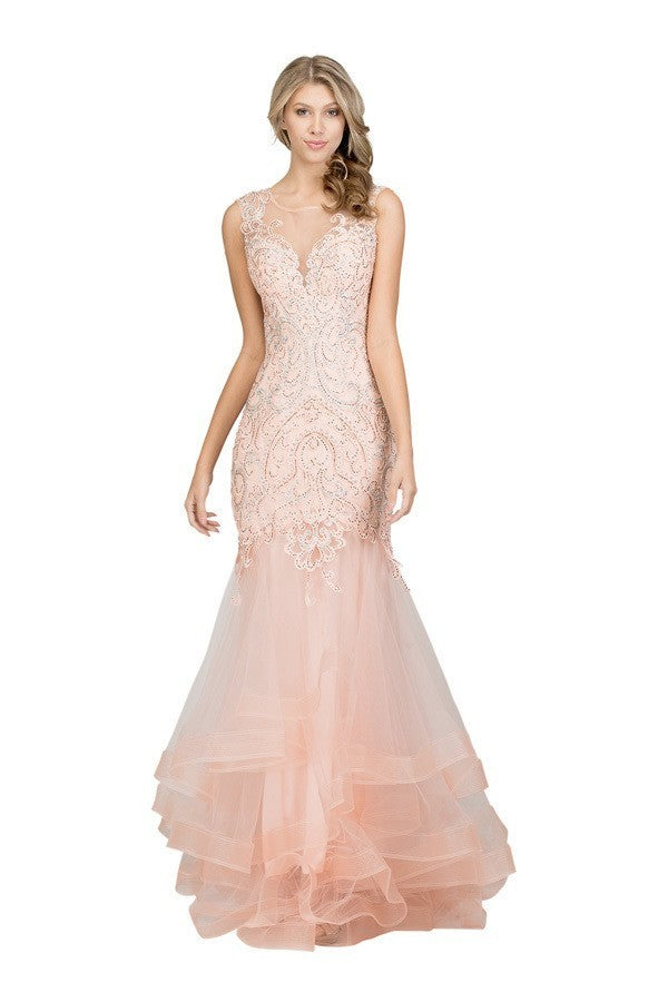 Vestido largo, corte sirena de tull con aplicaciones de bordados y detalles de strass tornasol.