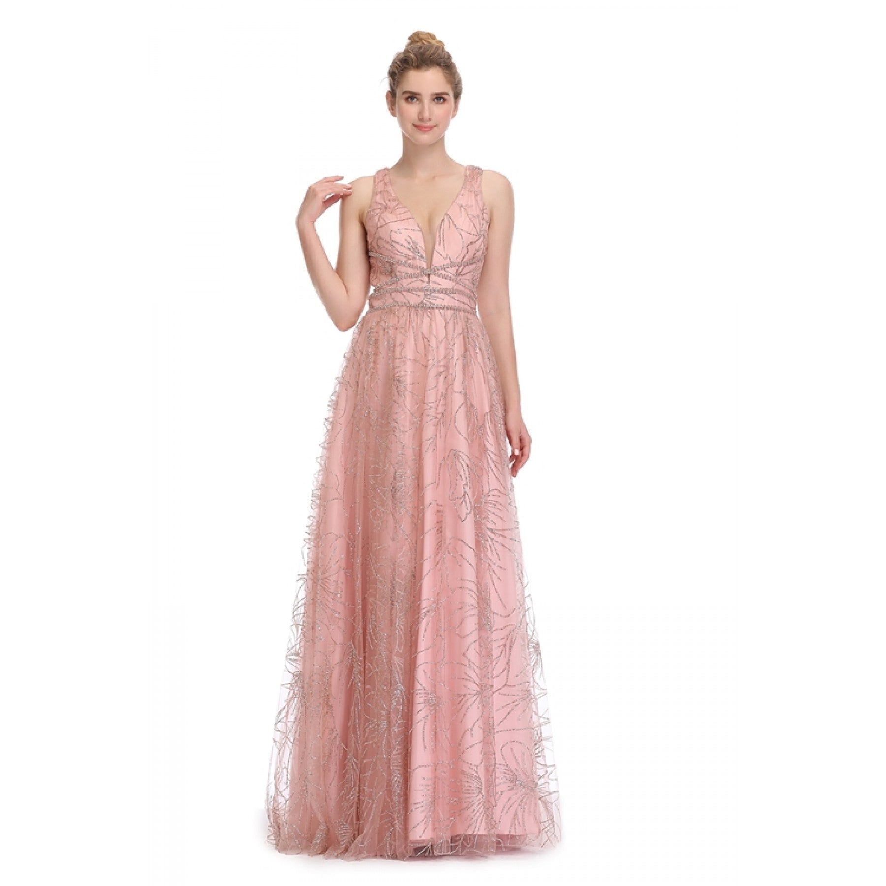 Vestido largo con cuello v, escote en la espalda y falda de tull escarchado