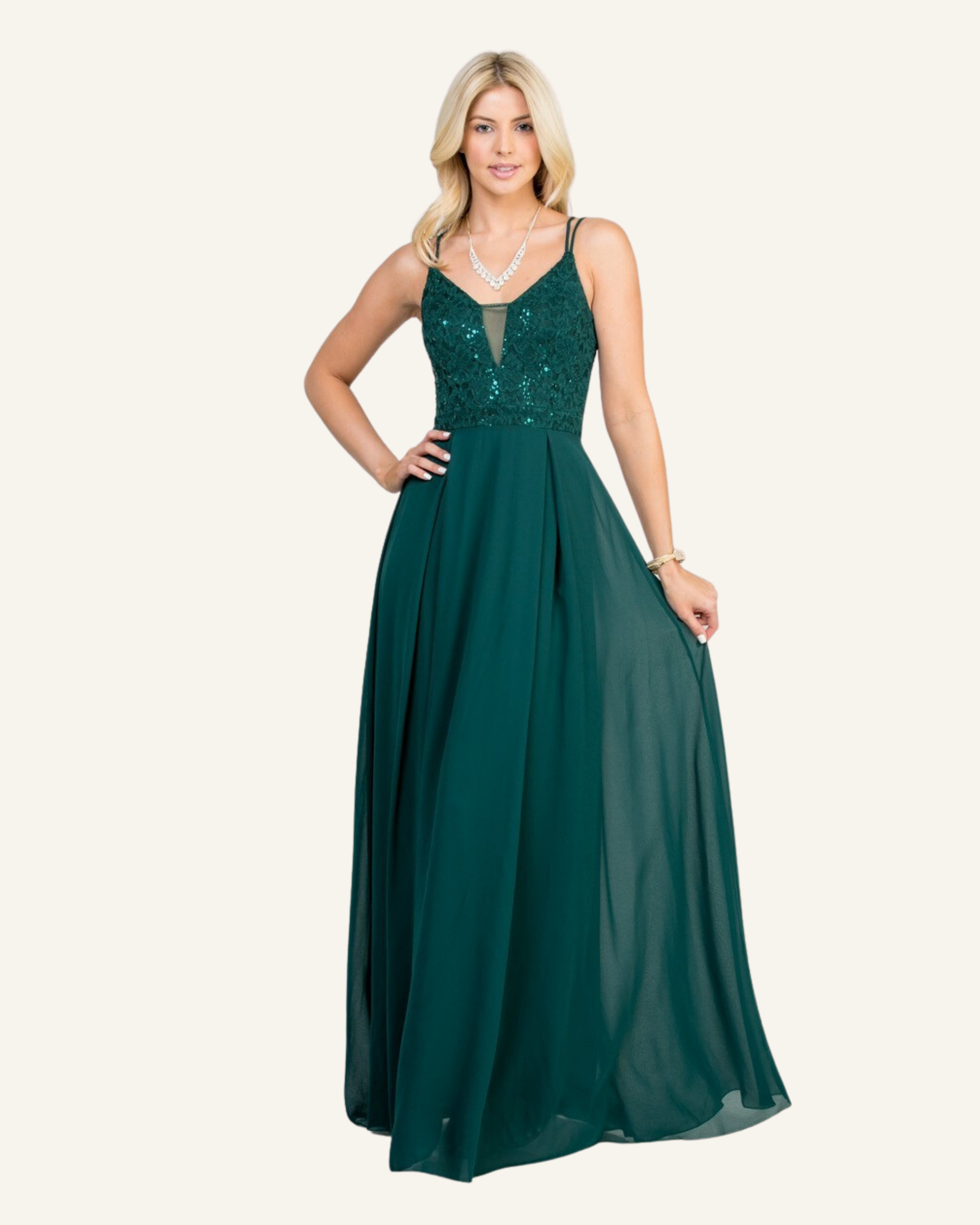 Vestido largo, corte A, cuello V, tirantes finos, encaje en el pecho, falda de gasa, transparencia de tul en el busto.
