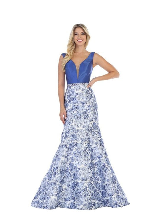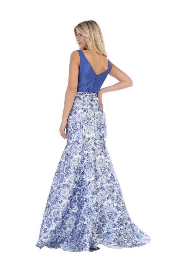 Vestido largo, sirena, cuello v, falda print floral
