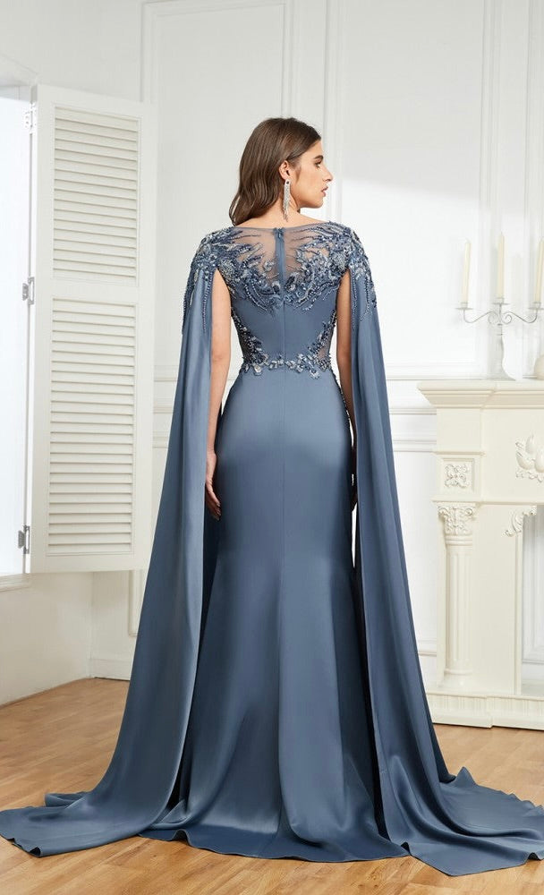 Este vestido es una pieza deslumbrante y sofisticada, perfecta para eventos elegantes. Tiene un diseño de corte sirena que se ajusta al cuerpo, acentuando la figura con un aire glamoroso. El escote es en forma de V con aplicaciones bordadas que añaden un toque de lujo y detalle intrincado. Las mangas están integradas con una capa larga que cae hasta el suelo, brindando un efecto de capa que añade drama y elegancia.