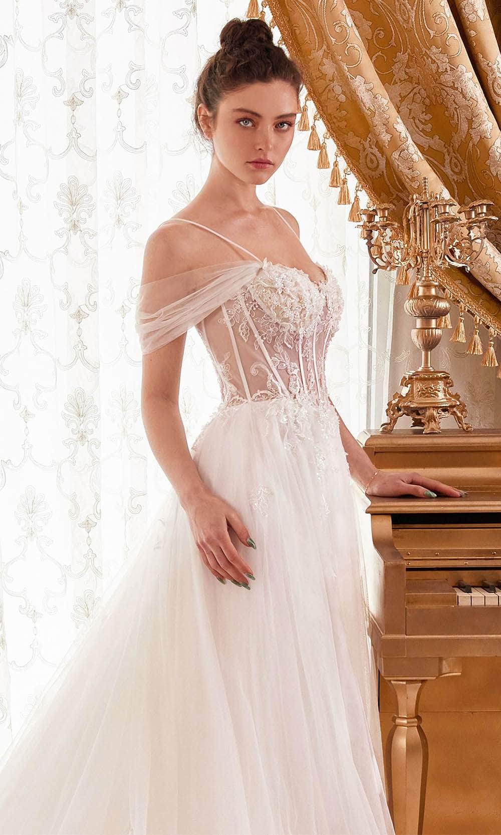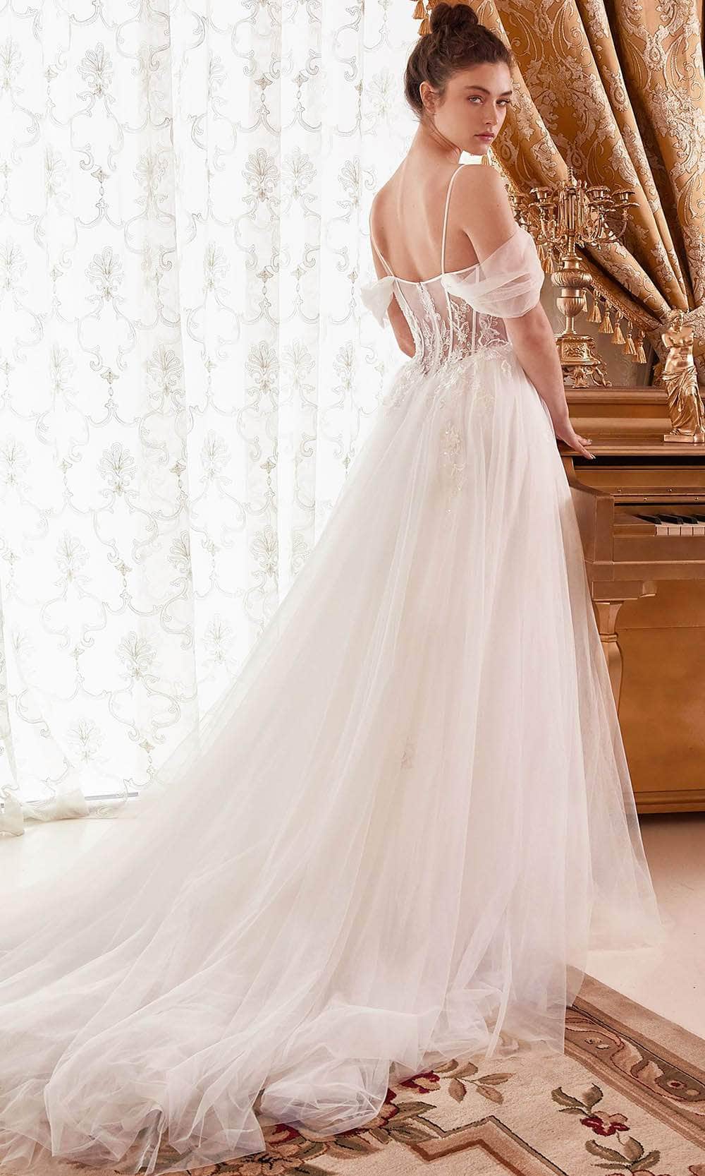 Vestido largo de tull con detalles de pedrería en el pecho, off-shoulders, corte A.