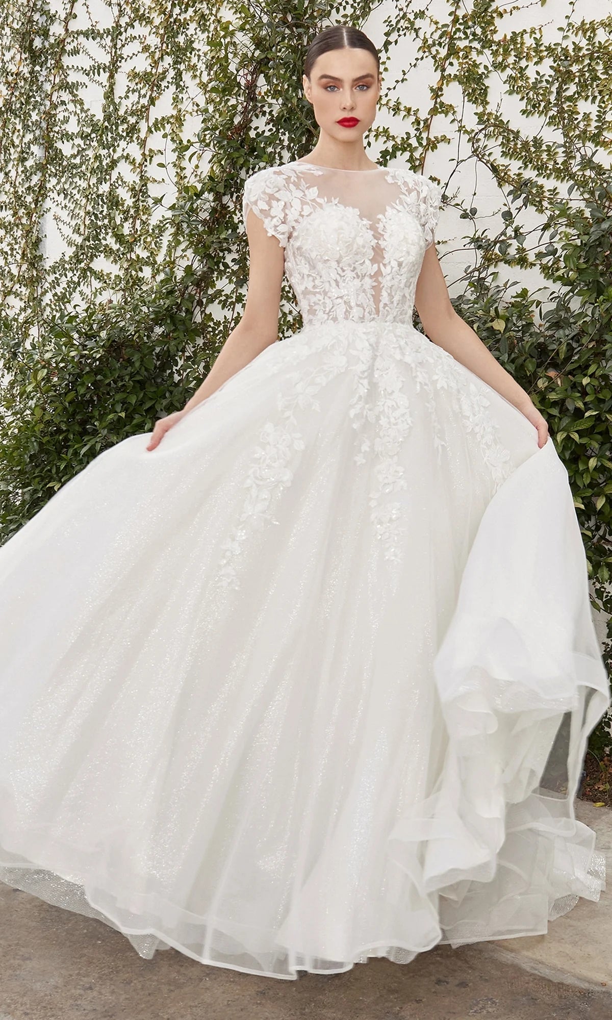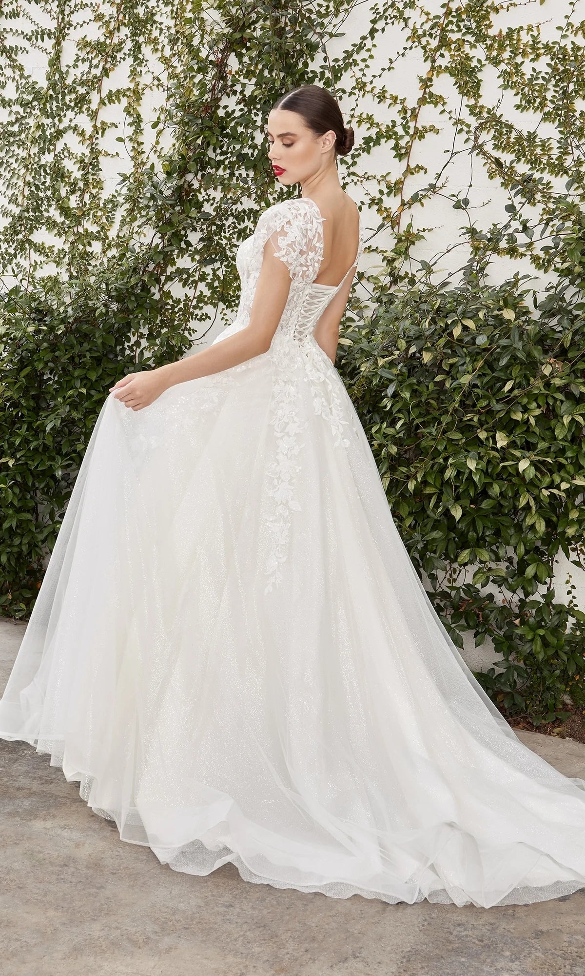 Vestido largo, corte A, con un escote profundo de tul contornea el busto hasta la cintura, adornado con encaje Chantilly en el corpiño y la falda. Las mangas cortas caen sobre los hombros uniendo todo con un corsé ajustable en la espalda.
