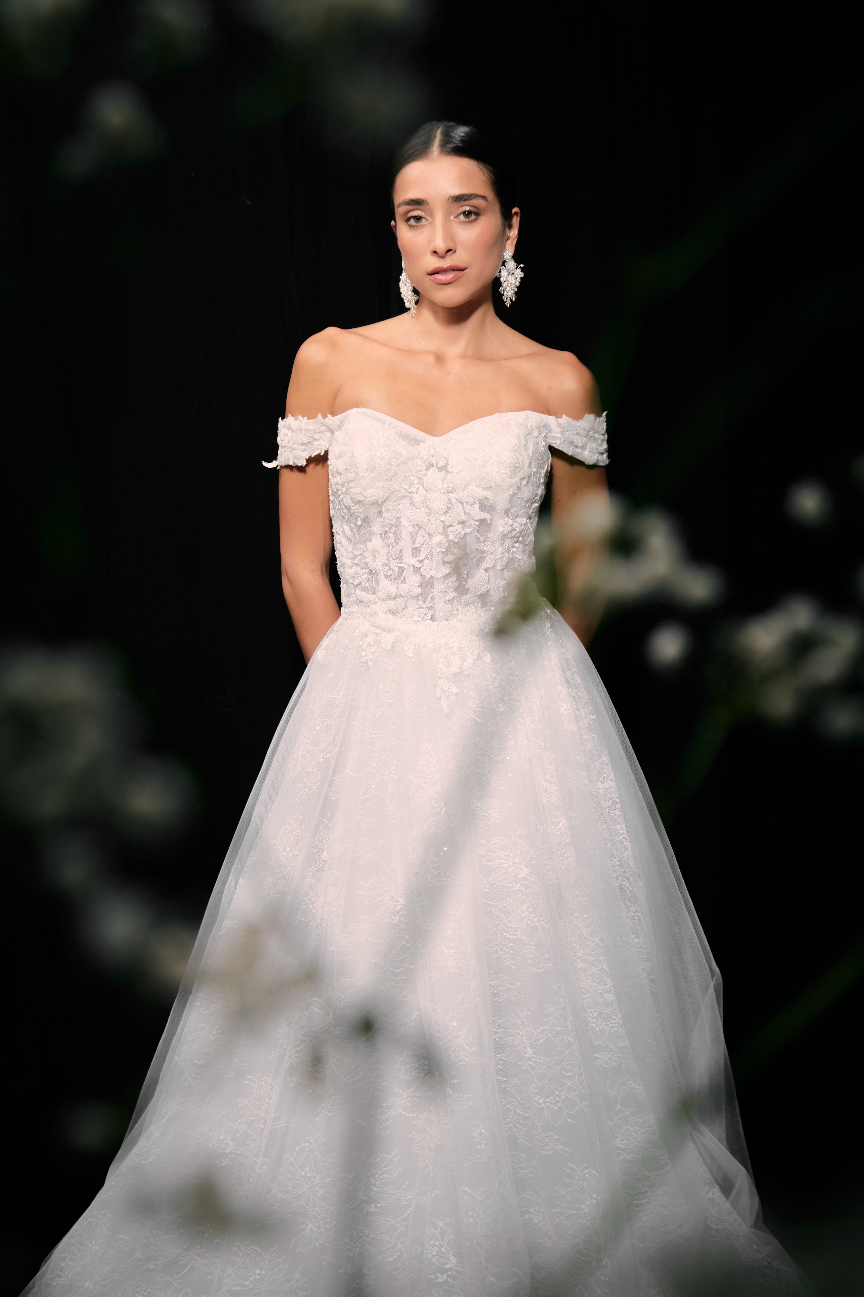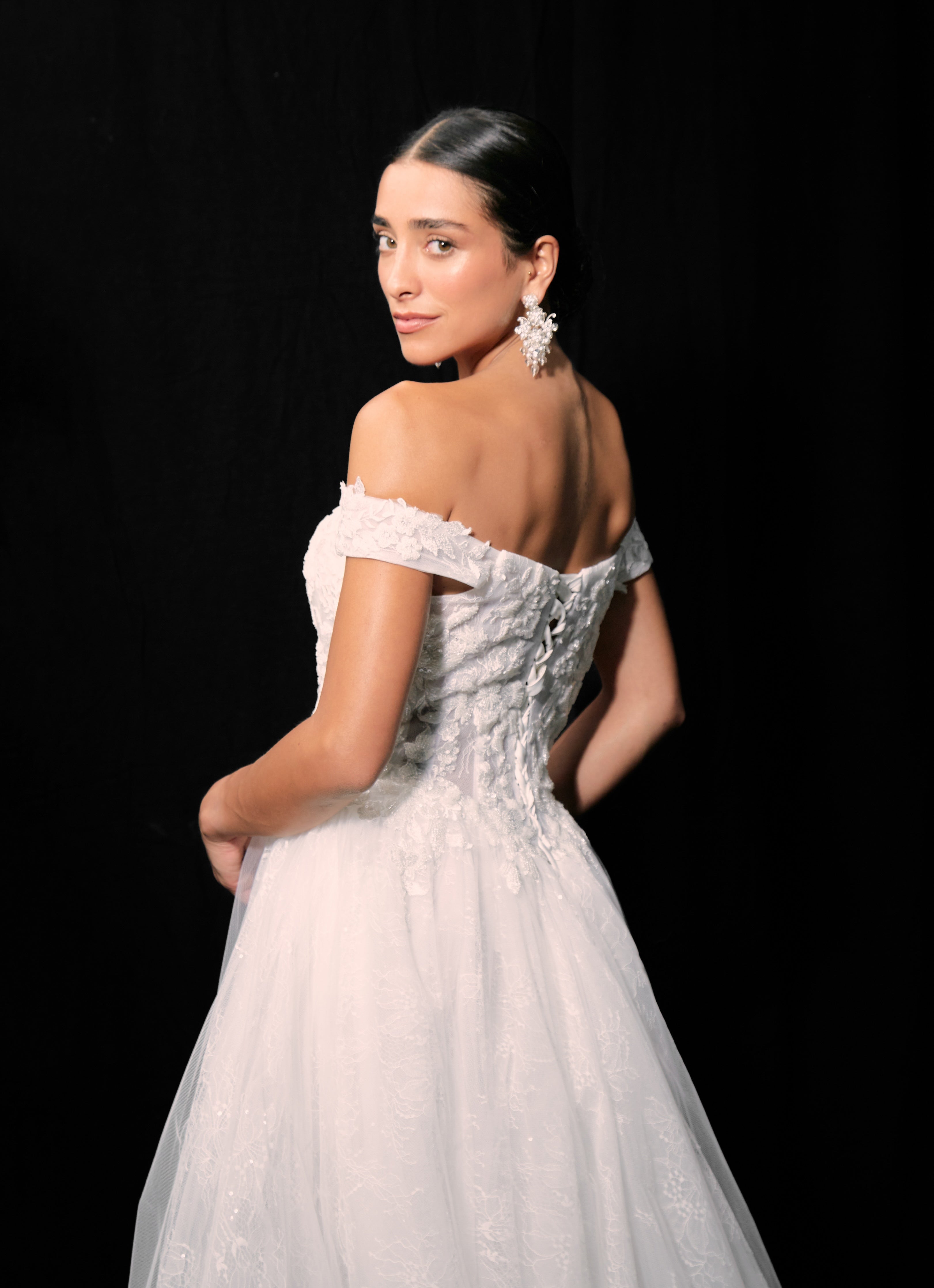 Vestido largo, corte A de tul sobre encaje Chantilly. Off shoulders, corpiño estructurado con aplicaciones con pedrería Espalda con corsé ajustable y cola larga tipo godet.