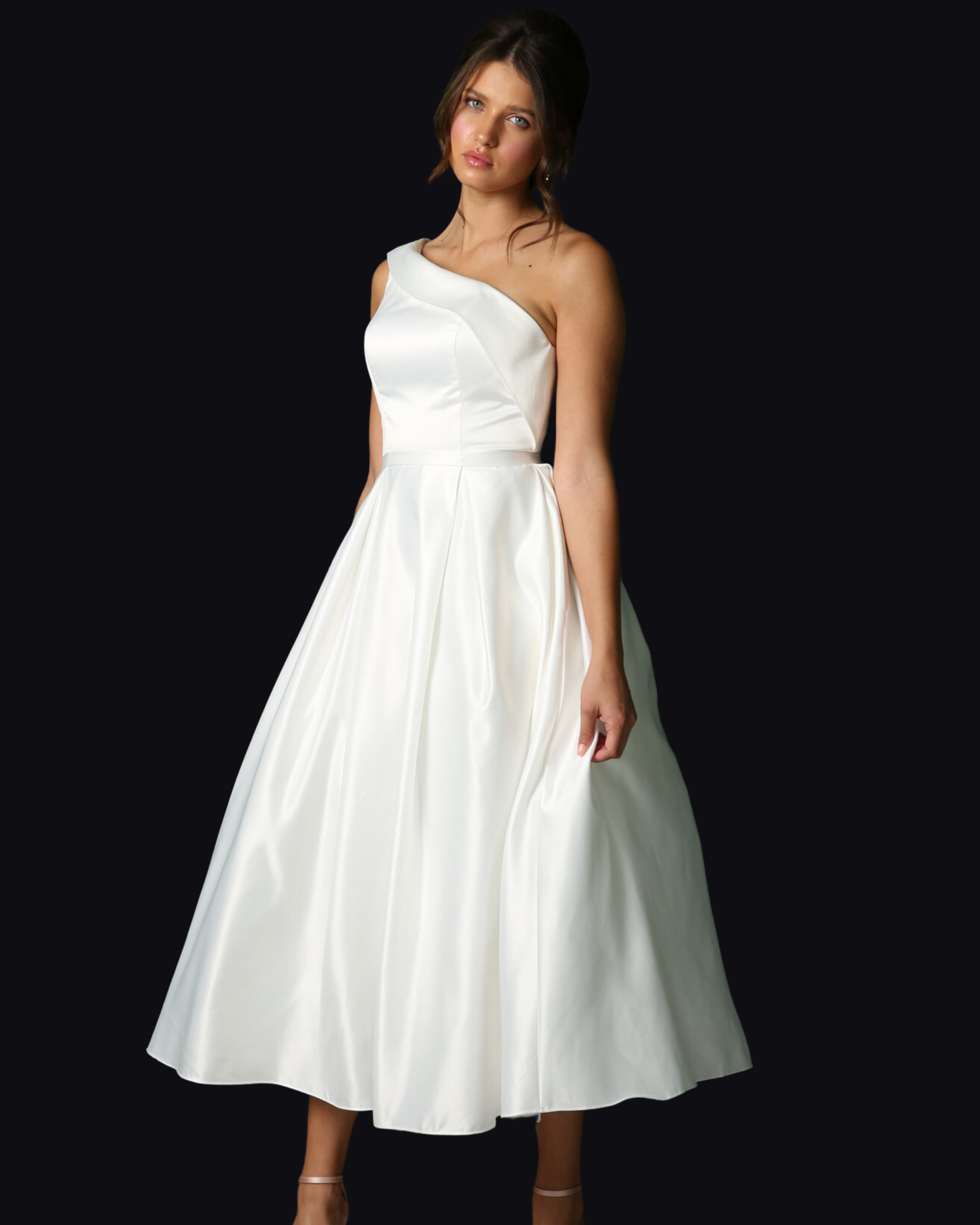 Vestido midi de satén, modelo un solo hombro con falda en corte A.