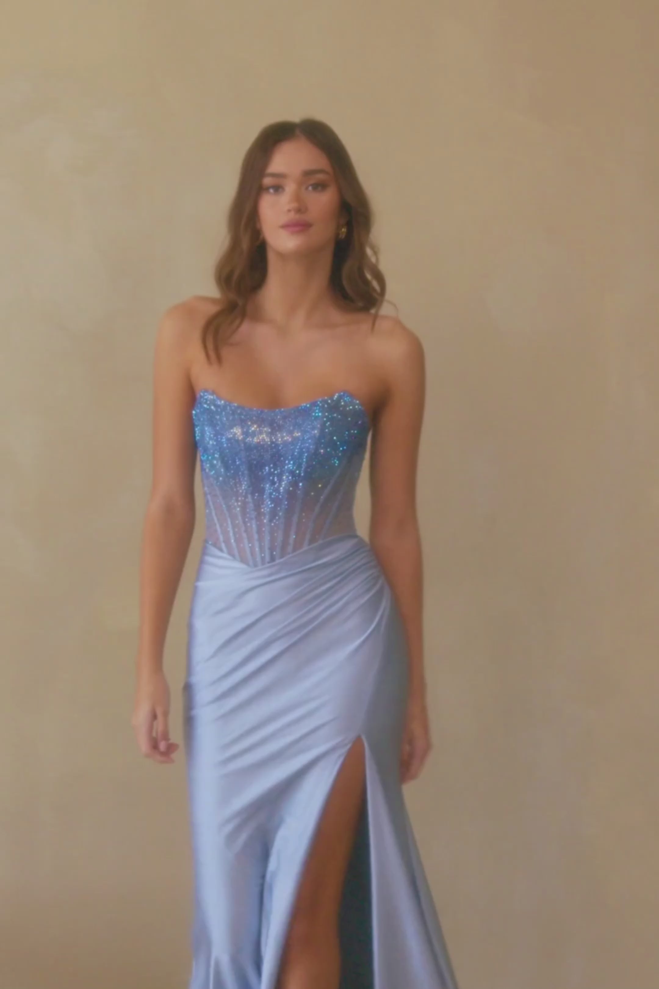 Vestido largo, strapless, detalles de strass en el corpiño, corsé ajustable en la espalda, abertura en la pierna.