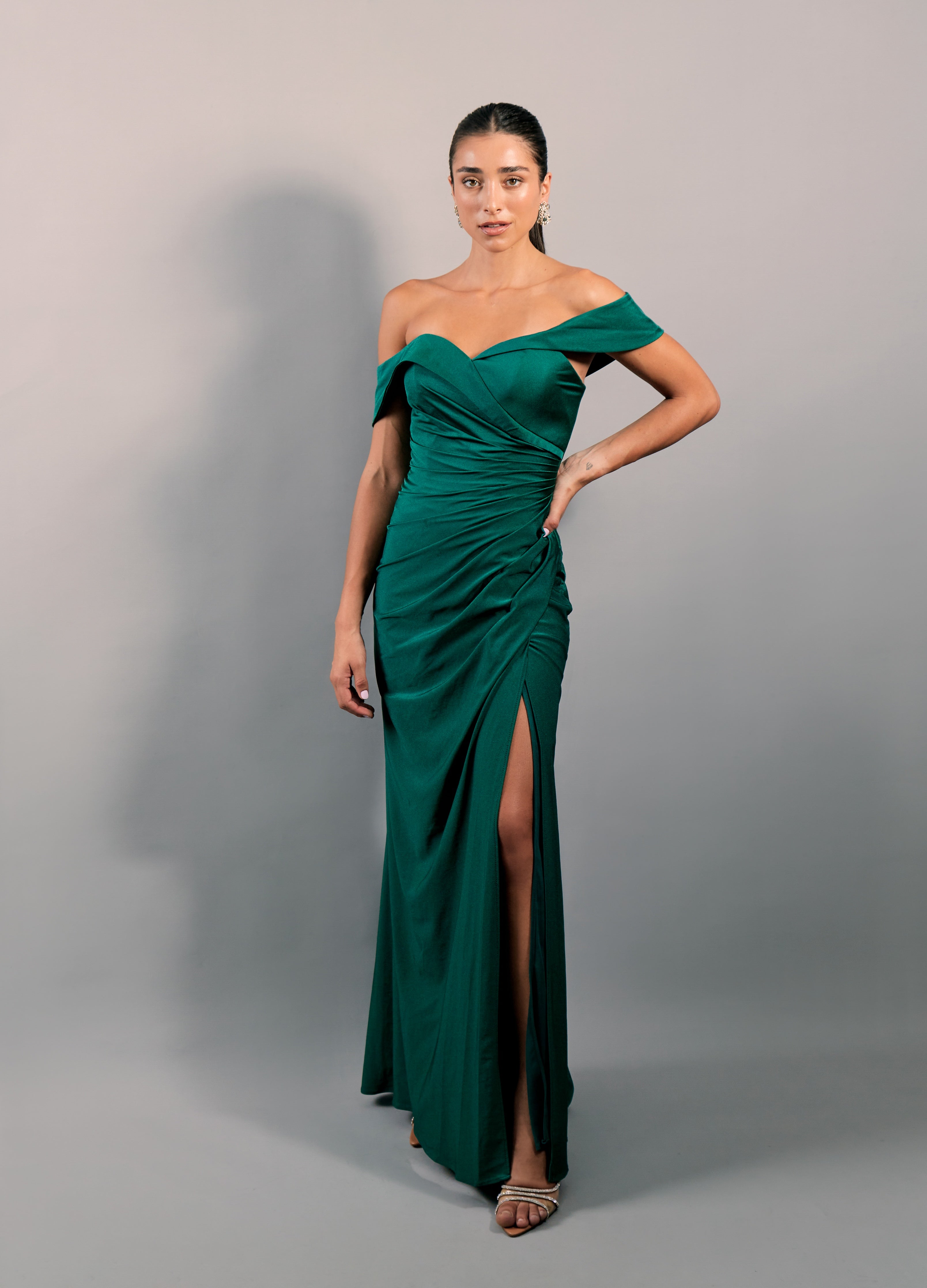 Vestido de satín elástico, cintura y cadera plisadas, escote en forma de corazón y abertura en la pierna.