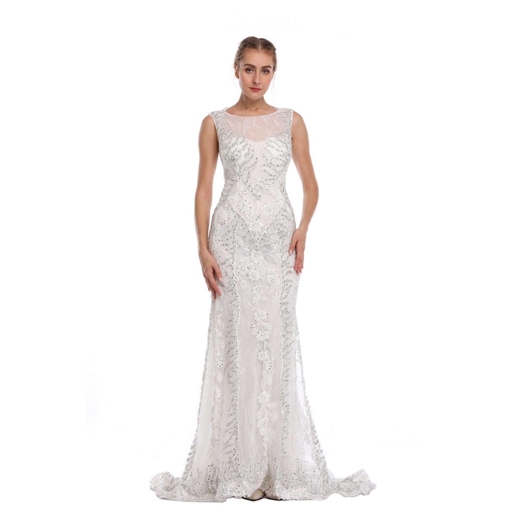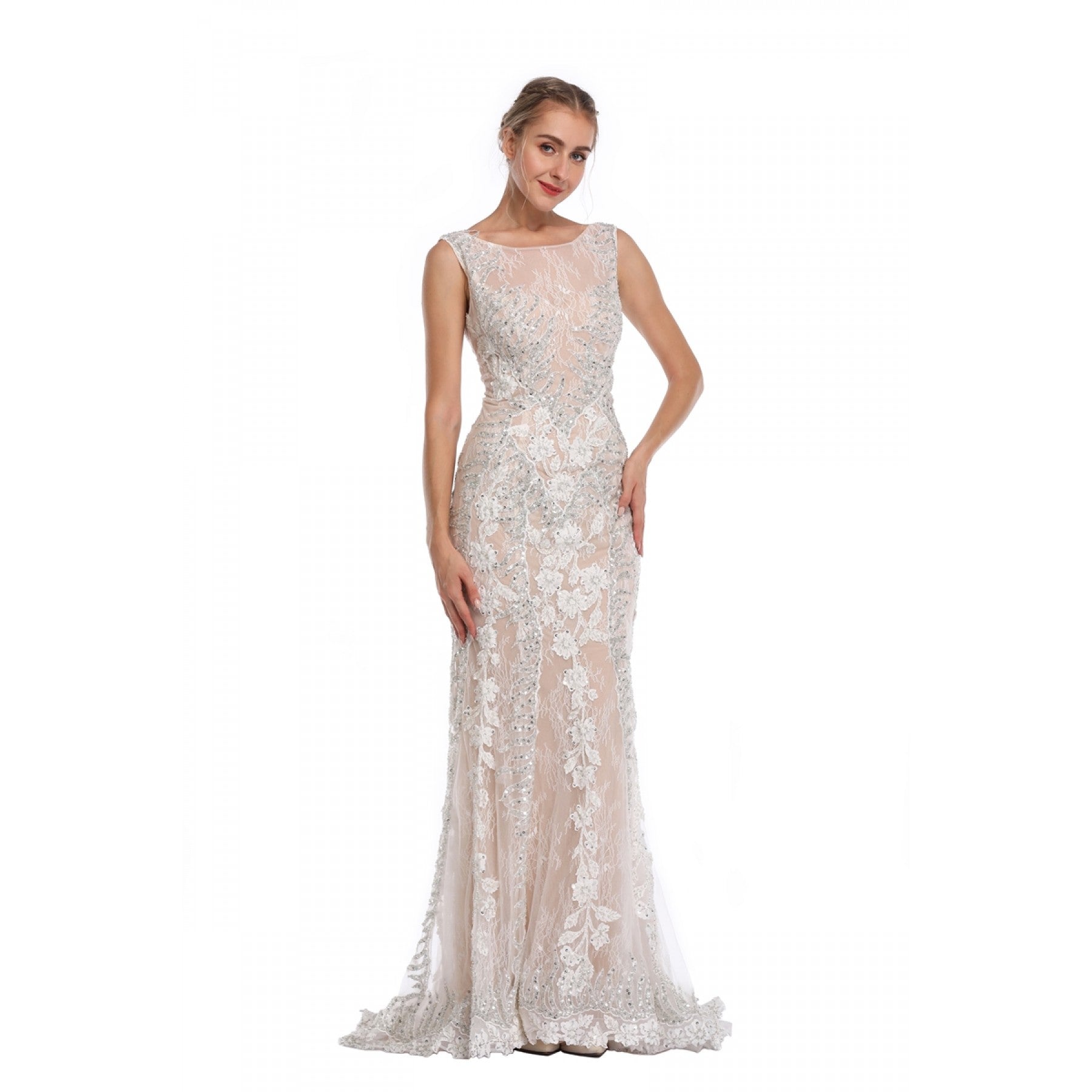 Vestido largo, corte sirena, cuello redondo con pedrería y bordado plateado.