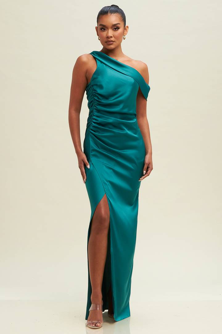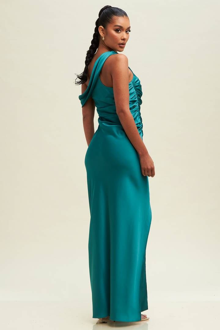 Vestido largo, corte sirena, drapeado a un costado, desde el busto hasta la cadera.