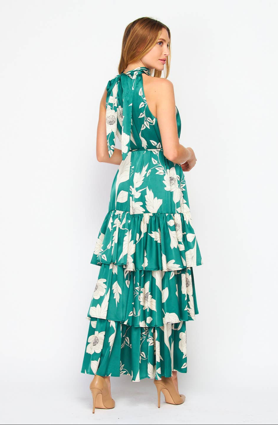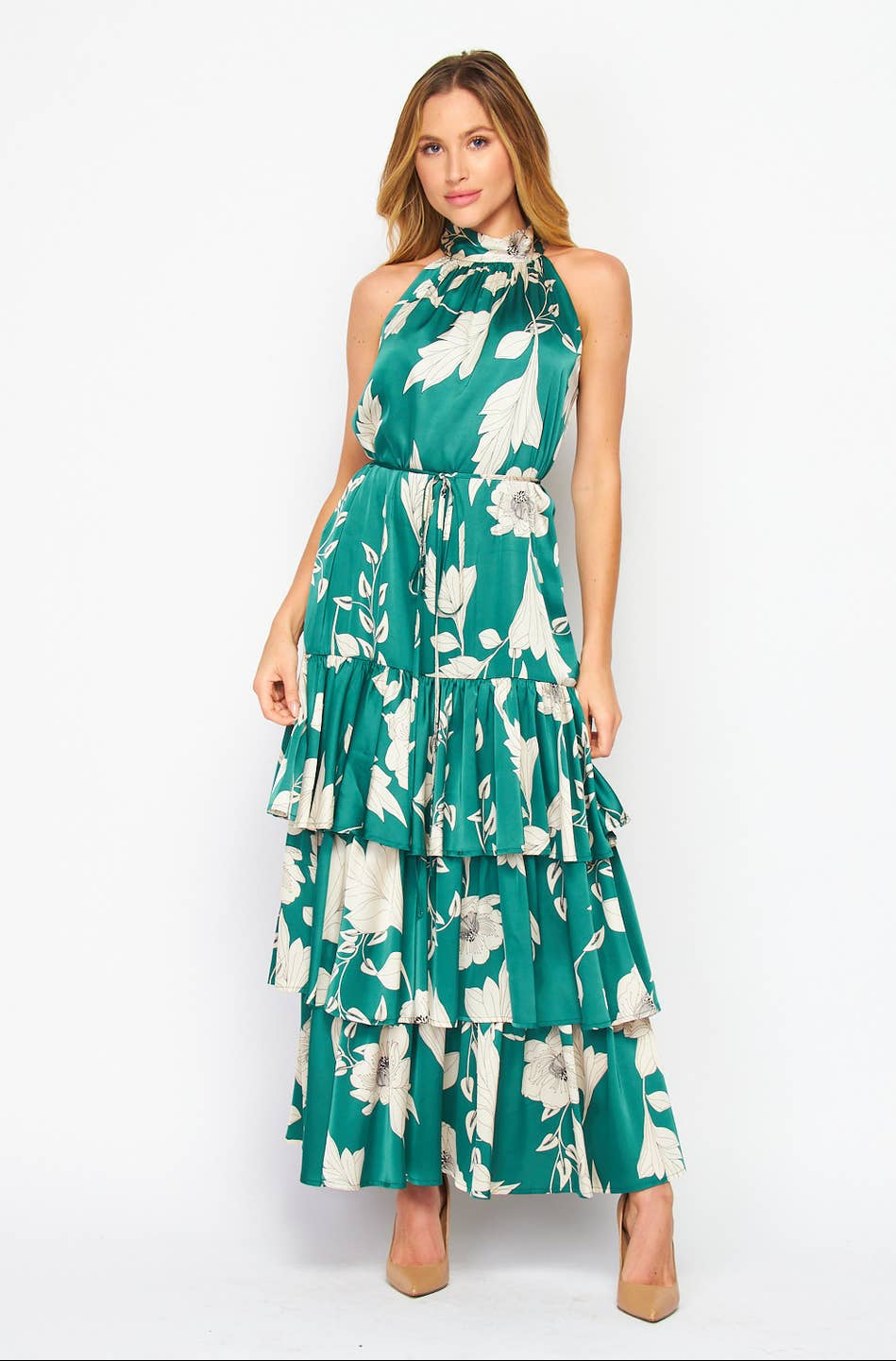 Vestido largo de corte A-line con escote halter y falda de capas. El corpiño presenta un diseño sin mangas con un elegante escote halter, mientras que la falda de capas fluye desde la cintura natural hasta el suelo, creando una silueta favorecedora.