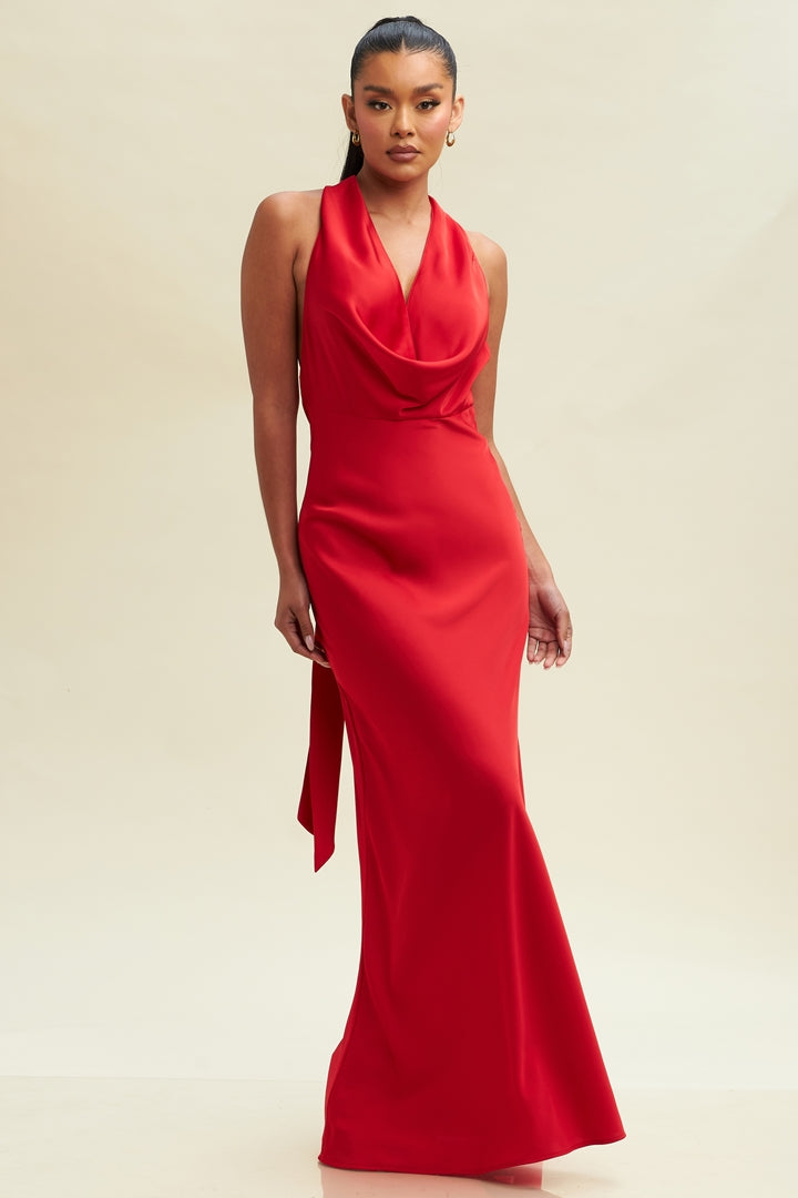 Vestido largo de satén con escote halter y diseño sin mangas. El corpiño presenta un escote pronunciado, mientras que la falda fluye suavemente hasta el suelo, creando una silueta elegante.
