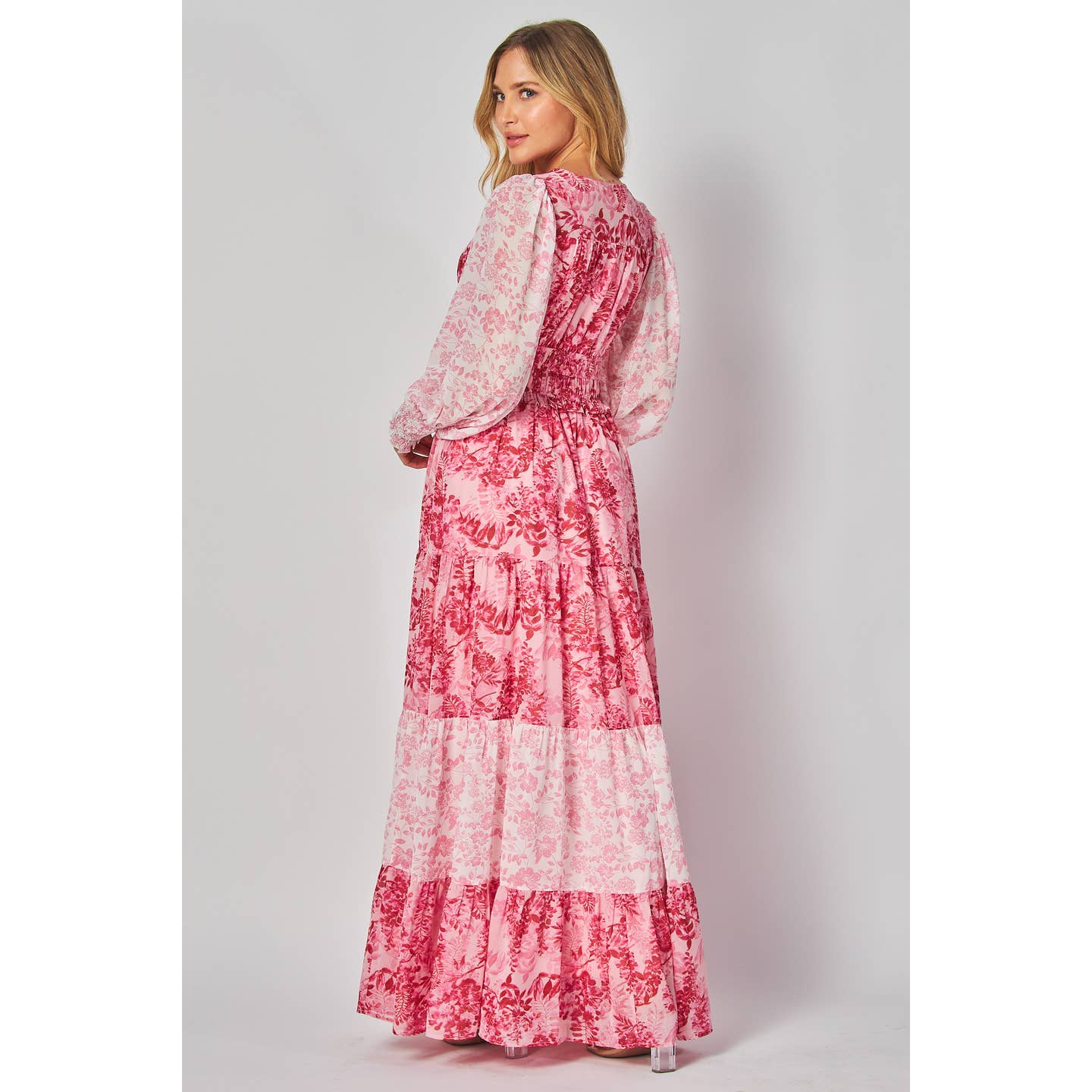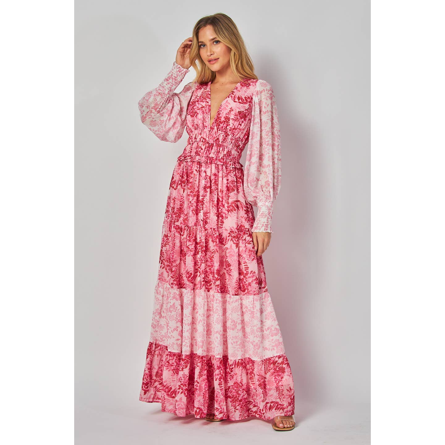 Vestido largo de corte A-line con escote halter y estampado floral en tonos contrastantes. El corpiño presenta un diseño sin mangas con un elegante escote halter, mientras que la falda de capas fluye desde la cintura natural hasta el suelo, creando una silueta favorecedora.