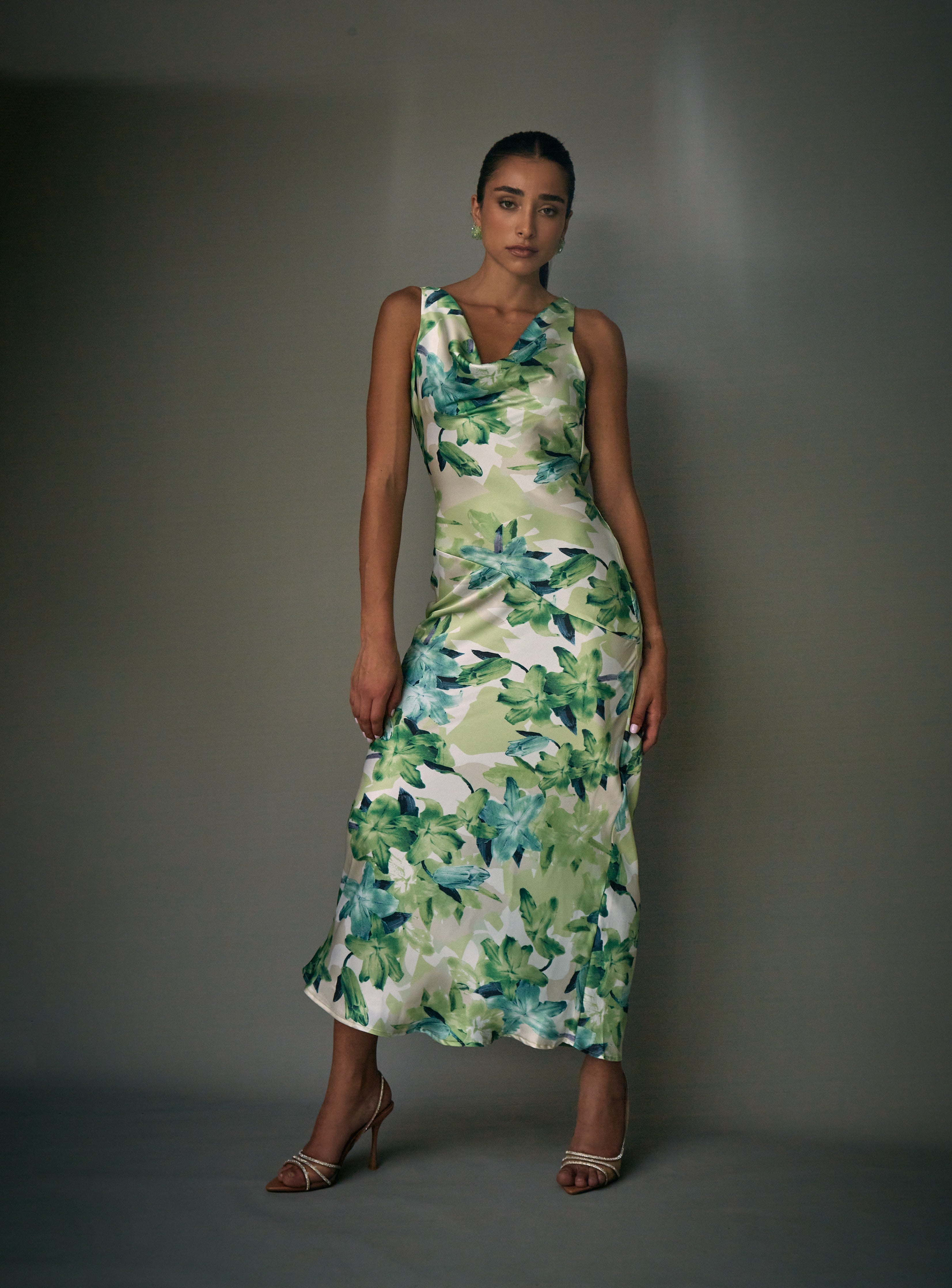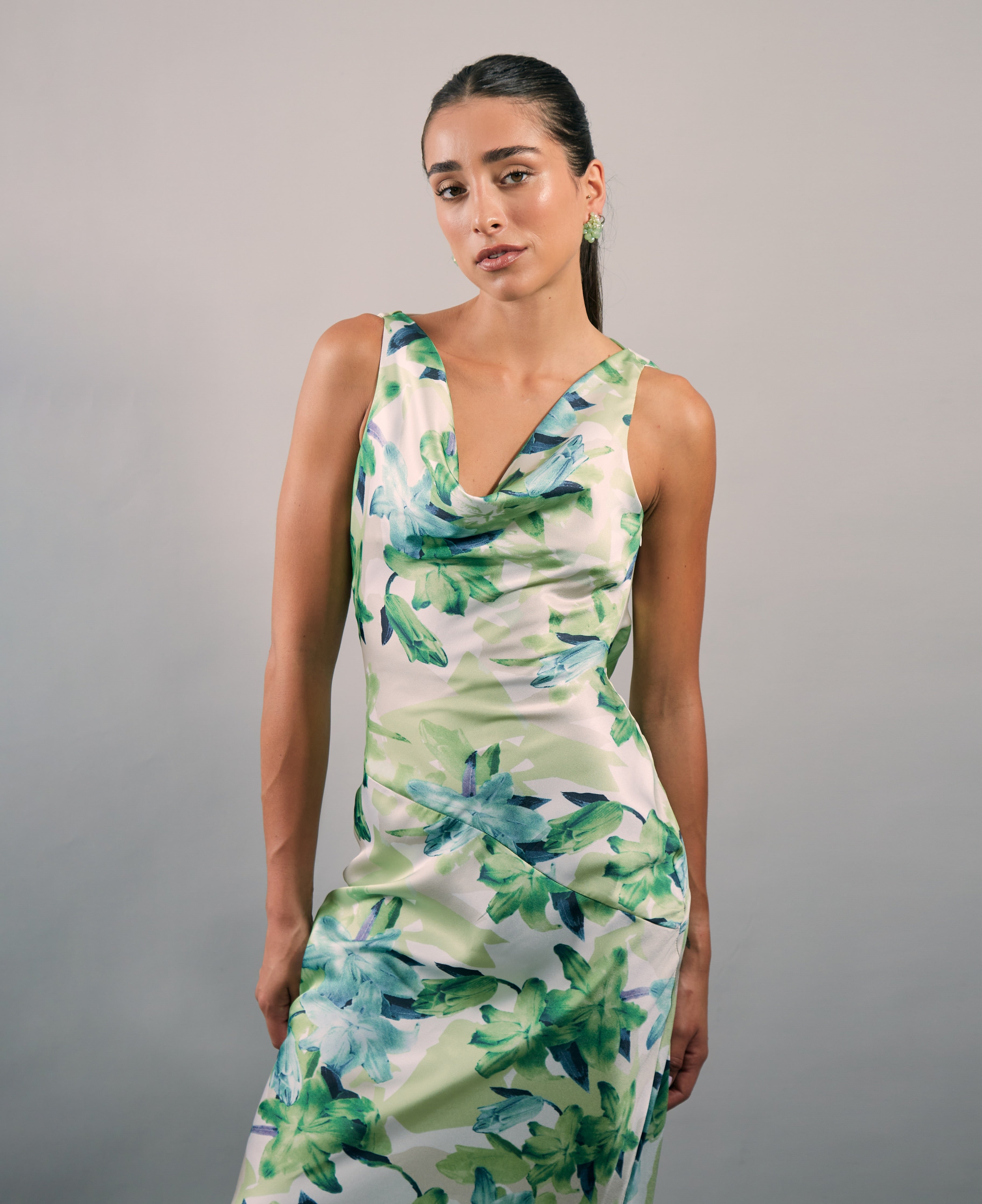 Vestido largo, corte sirena, escote tortuga en V en el busto y en la espalda.
