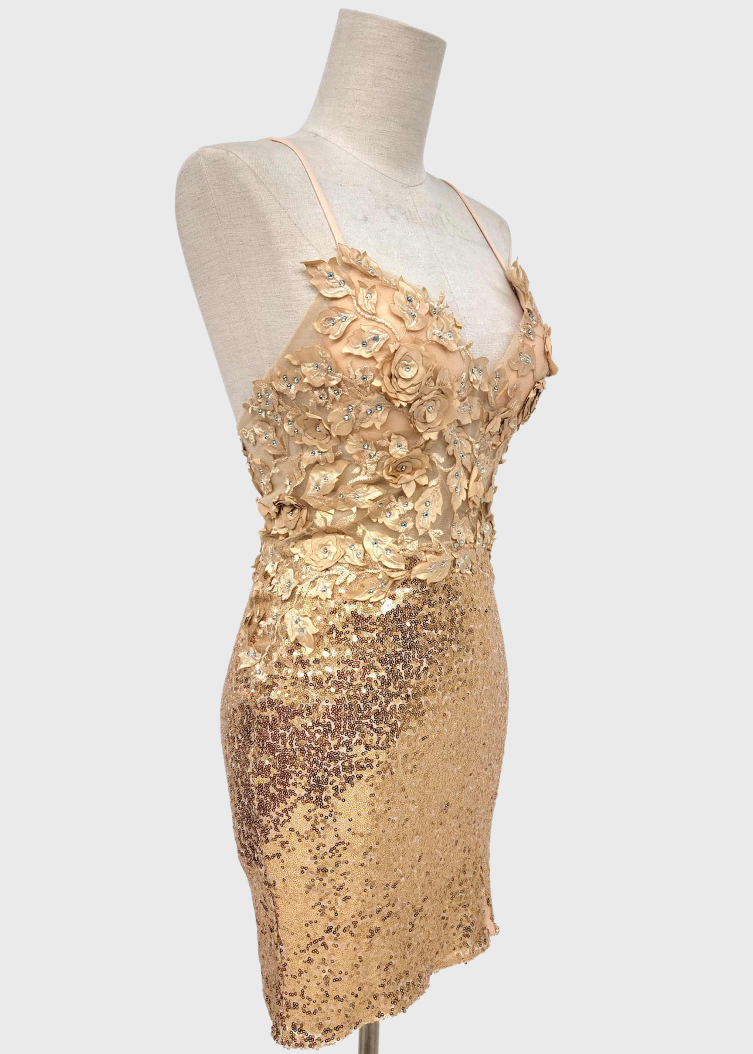 Vestido corte sirena de lentejuelas con escote en la espalda y aplicaciones de rosas con pedrería.