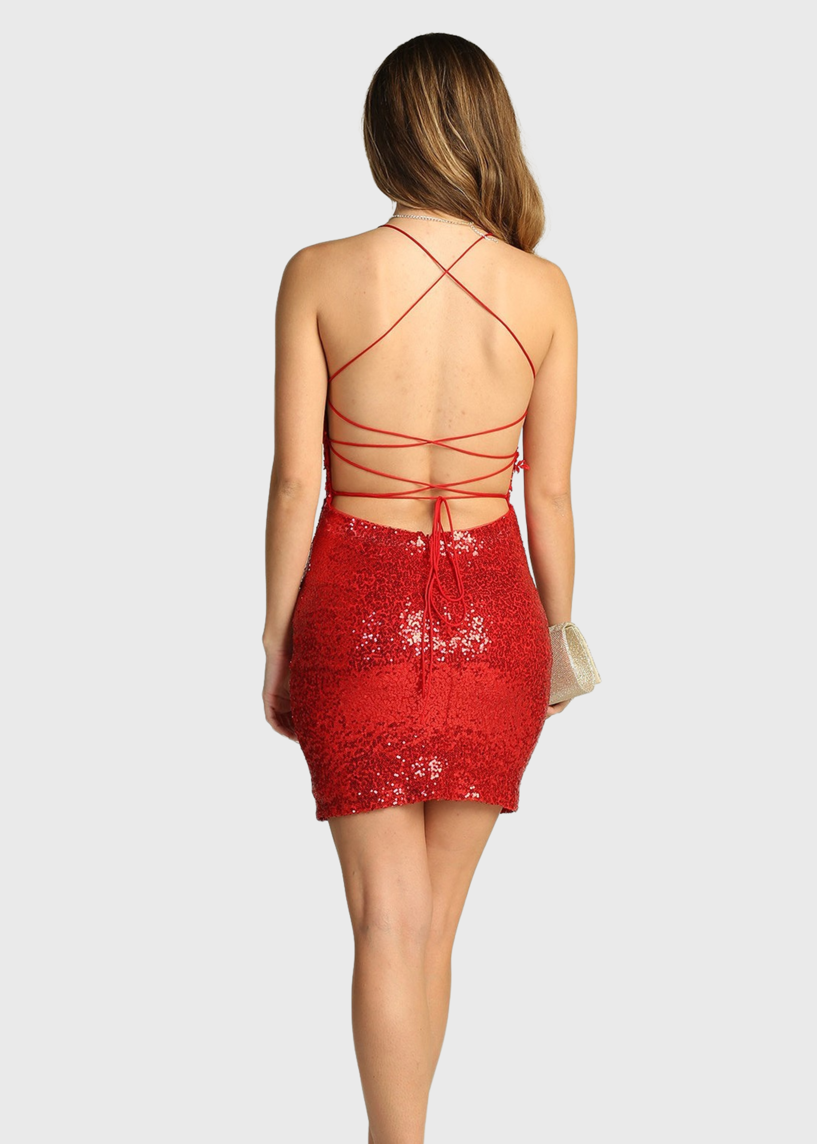 Vestido corto, sirena, cuello v, falda de lentejuela y escote en la espalda