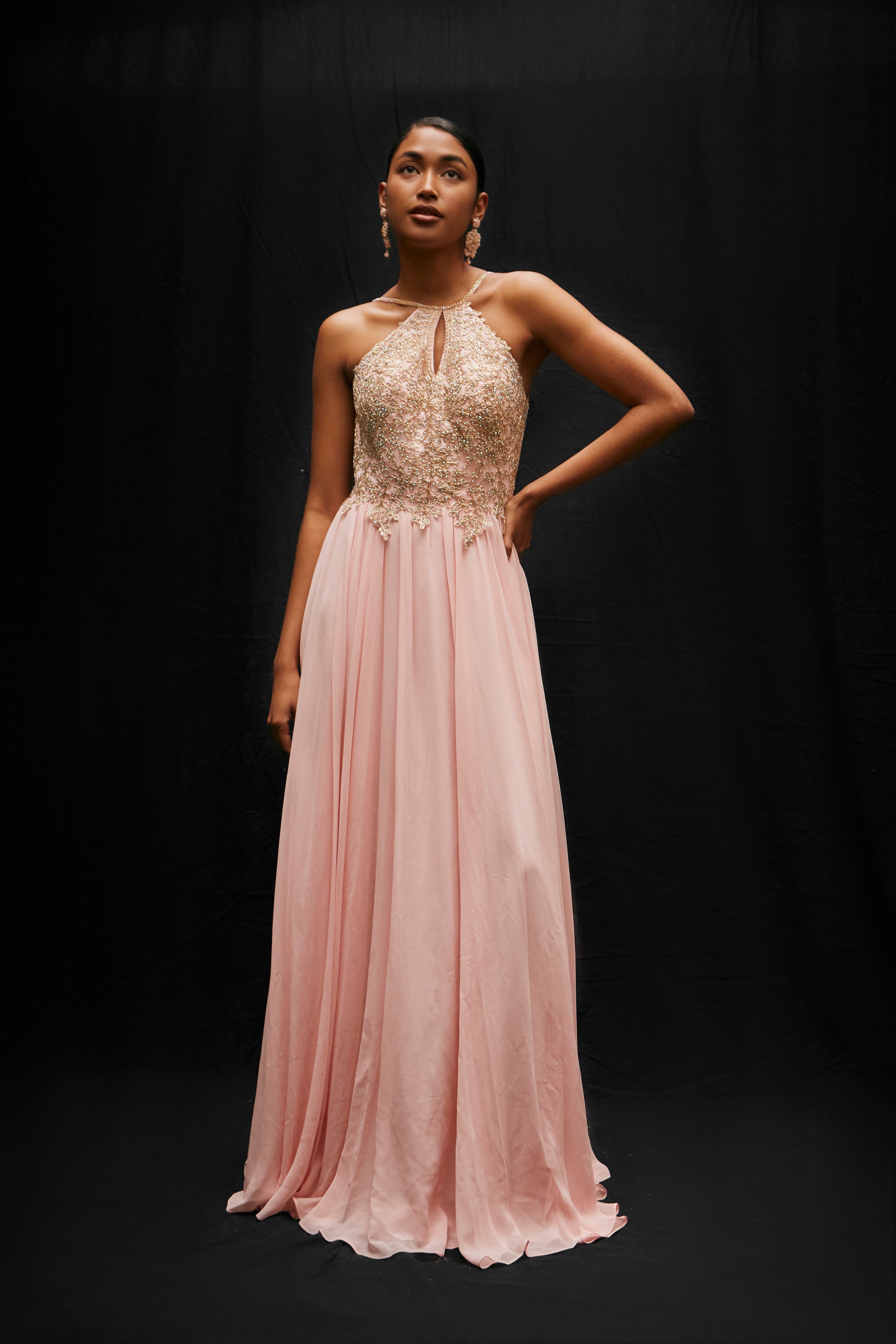 Vestido largo de gasa con escote halter, aplicaciones de bordados dorados y detalles de strass tornasol.