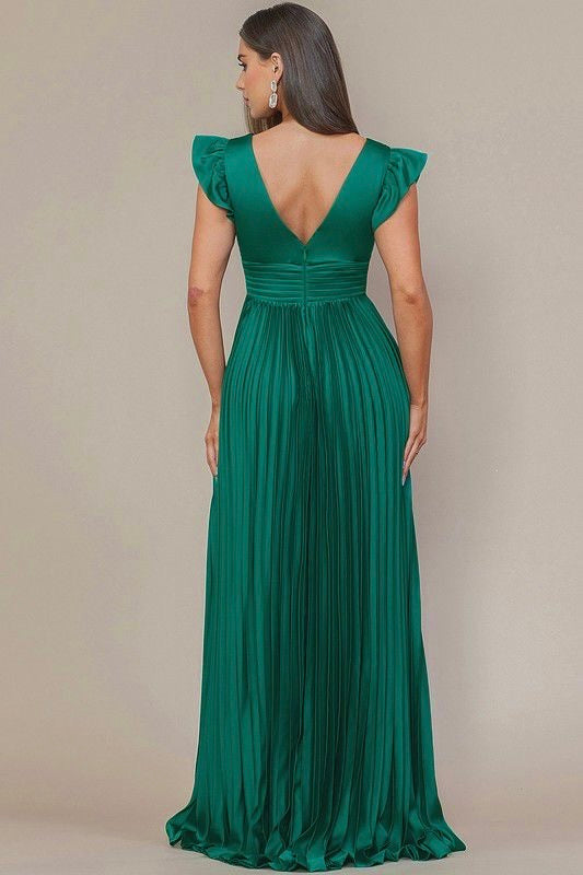 Vestido largo de satén plisado. Presenta un escote en V profundo y mangas cortas y amplias. La falda fluye hasta el suelo con un corte recto y pliegues que añaden elegancia y movimiento al diseño. Incluye un cierre con cremallera en la parte posterior para un ajuste seguro.